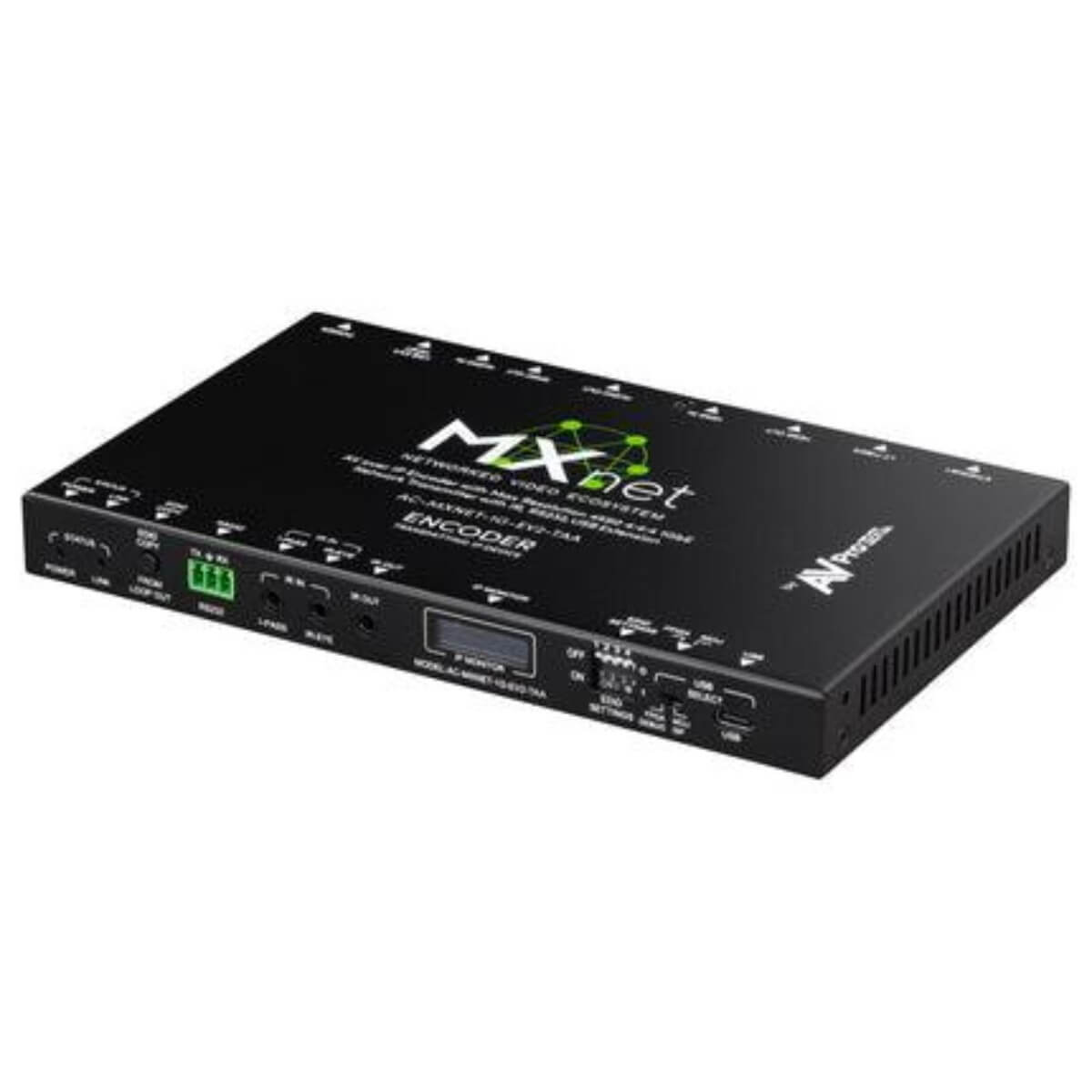 This is the TAA Compliant of the AC-MXNET-1G-EV2 represents the next step forward on the evolutionary path of the MXnet Platform, encompassing an industry-first, holistically integrated approach to AV over IP video distribution from a solo manufacturer. AVPro Edges exclusive MXnet Platform offers the only proprietary, hyper-optimized AV over IP ecosystem of network-based encoders, decoders, and managed switches guided from a centralized control unit by MXnet Mentor, our in-house engineered system setup and control solution. Click here for the non-TAA equivalent. AC-MXNET-1G-EV2, an Evolution II Encoding/Transmitting device, incorporates a newly designed AVPro Edge application-specific integrated circuit (ASIC) that introduces an improved software-based video encoding/decoding engine into the IC for enhanced video processing. Refinements to the IC include native support for 4K/60fps 4:4:4 signals (RGB and YCbCr @10- and 12-bit), plus extended audio capabilities to support high bitrate multi-channel formats, including Dolby Atmos and DTS:X for IMAX Enhanced soundtracks. All MXnet first-generation encoder features are retained for use with the AC-MXNET-1G-EV2. As a member of the AVPro Edge family of AV over IP products, an AC-MXNET-1G-EV2 is a gateway where a signal enters the MXnet Ecosystem, connected with category cable (AVPro Edge strongly encourages CAT-6a infrastructure for all MXnet system deployments: however, for MXnet 1G, Cat-5e will comfortably transport MXnet 1G data signals) or fiber optic cabling, to an MXnet switch or any compatible multicast-capable managed L3 network switch. A connected HDMI source will have audio and video signals encoded into a multicast data format for routing to any AC-MXNET-1G-EV2 system endpoint connected to the same MXnet switch. Encoded HDMI source signals up to native 4K/60fps 4:4:4 with Dolby Vision, HDR10, HDR10+, and HLG are passed to EVO II downstream AC-MXNET-1G-DV2 decoders, with RS-232 serial pass-through, IR control or USB signals also transportable inside encoded data packets. Encoding is executed using an optimized JPEG 2000 codec, which parses data at managed flexible rates to minimize bitrate errors (200Mbps for 1080p content, 300Mbps for 4K/30fps content, peaking at 850Mbps for 4K/60fps content). Frame-syncing Genlock is supported, with latency near zero and visually imperceptible. The AC-MXNET-1G-EV2 runs quietly and remains cool during operation, utilizing a fan-less design featuring chip-top heatsinking to efficiently disperse heat while limiting power consumption at typically 7 watts or less for stability and device longevity.