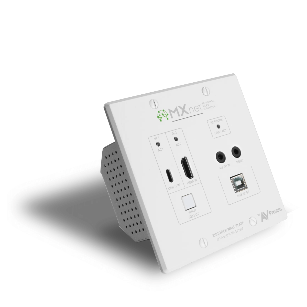The AC-MXNET-1G-EV2WP is an MXnet Evolution II encoder with selectable switching between the HDMI and USB-C inputs, packaged in an elegant, low-profile wall plate. As a wall-plate version of the AC-MXnet-1G EV2, system encoding may now be placed where it is most convenient. A/V signals are converted into precision multicast data packets, routed to any or all system decoders via category cable (CAT-6A is strongly recommended) tethered to an MXnet PoE network switch, which also powers the unit. AC-MXNET-1G-EV2WP multicast encodes HDMI content up to 4K/60 fps, including HDR and Dolby Vision, with 8-, 10-, and 12-bit color depth. It is capable of full chroma subsampling, from RGB to 4:4:4, while supporting all 3D immersive audio formats. Proprietary Video and Audio Codecs based on modified M-JEG algorithms manage data in a parsed, flexible manner that minimizes bitrate errors, allocates adequate signal headroom, and optimizes compression for artifact-free, visually lossless image fidelity. Applications best suited to the AC-MXNET-1G-EV2WP might include installation into a wall adjacent to a desk, creatively flushed into the desktop, or a lectern for religious or performance hall projects. For educational environments, a substitute educators portable laptop in a locked office and not permanently installed in a system rack may be controlled from the classroom via an AC-MXNET-1G-EV2WP. In governmental or judicial applications, a clean, clutter-free installation is made possible, as is convenient, fool-proof input selection, from the plate-embedded push button switch.