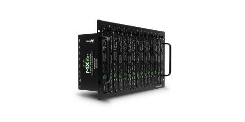 The AC-MXNET-1G-R15 is a 6-RU tall, heavy-duty rack accessory designed to vertically organize up to 15 MXnet 1G Ecosystem encoders, decoders, and the AC-MXNET-1G-CBOX-B for optimal ventilation. This rack has all the necessary mounting hardware and includes two blank plates, with additional blanks sold separately. Numbered slots enable easy identification in large installations.