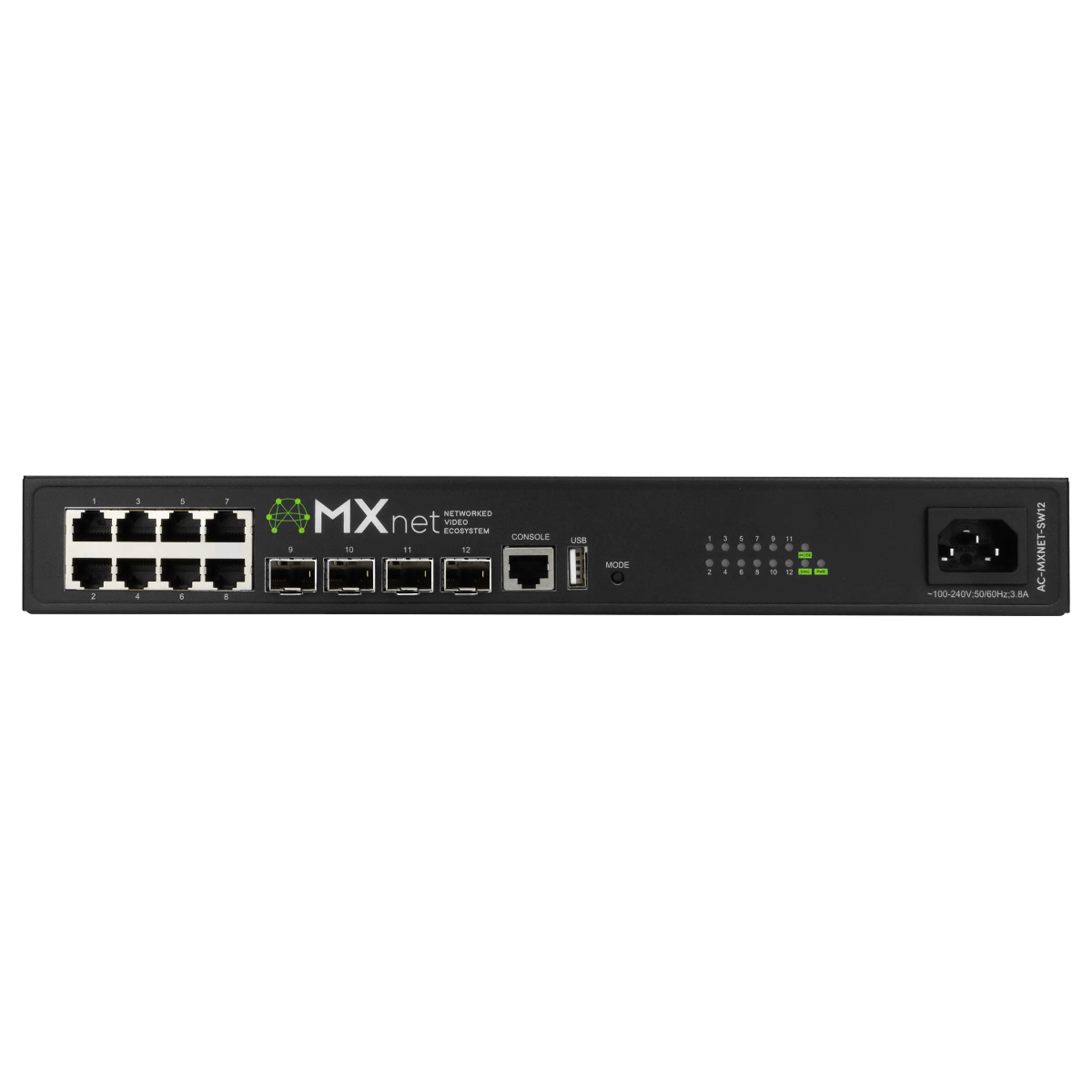 Slotting into the MXnet ecosystem as a fast switching, low latency 12-port network switch for basic systems, the AVPro Edge AC-MXNET-SW12 is also perfect as a stackable add-on unit to our 24-port and 48-port switches, providing a flexible, lower cost extension option for planned or emergency system expansion. Four 10 Gbps SFP+ ports facilitate link aggregation through MXNets Mentor software. AC-MXNET-SW12 leverages the network operating system developed by AVPro Edge for the AC-MXNET-SW24 and AC-MXNET-SW48 network switches to analyze multicast packetization and optimize switch speed for data throughput. Like all AVPro Edge switches, the AC-MXNET-SW12 is preconfigured for plug-and-play simplicity with the MXnet ecosystem.
