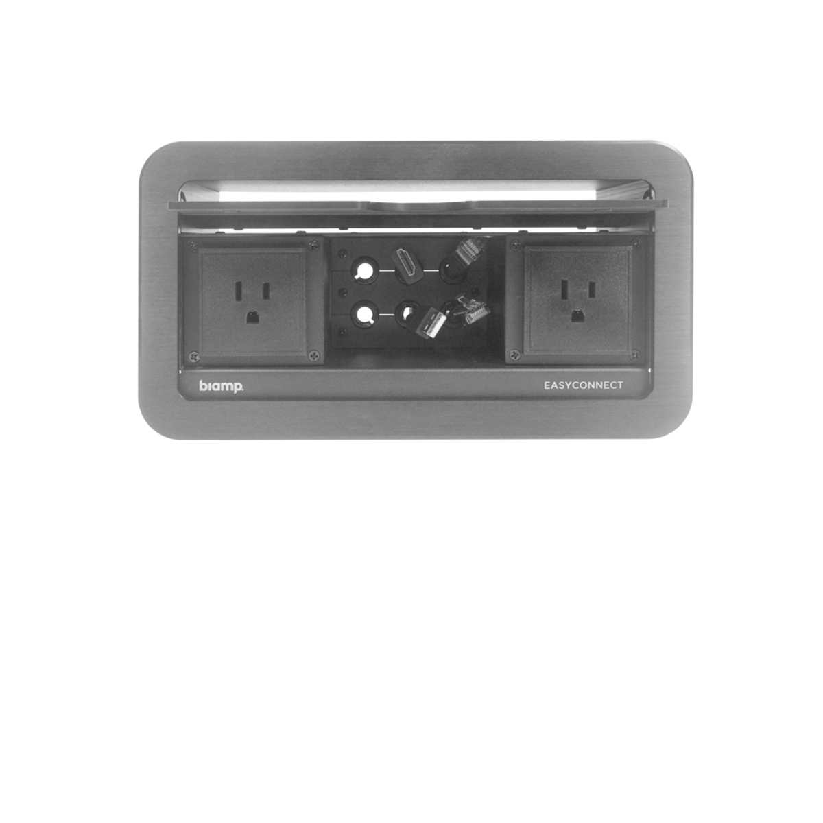 The EasyConnect EC-P tabletop cable management solution is designed to provide easy connectivity for conference room users. The sleek box mounts into the table, neatly storing Ethernet, HDMI, and USB cables for easy access. The EC-P series includes two AC power receptacles, and is easily customized to fit your needs, adding efficiency and style to any meeting space.