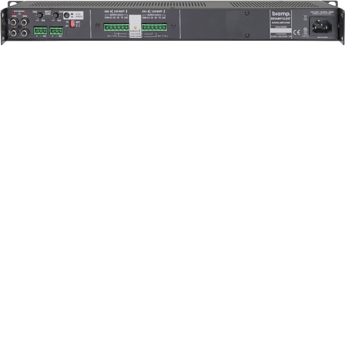 Immaculate sound performance, extremely reliable, maintenance-free -- this is how Biamp would describe their latest REVAMP2120T. This 2-channel digital power amplifier provides 2 x 120 watts output power @ 100 volts or @ 4 ohms, that can easily be bridged into a powerful 240 watts @ 100 volts or 8-ohm single amplifier. The REVAMP2120T is a convection cooled class-D amplifier without built-in fans which ensures that the amplifier is noiseless and dust-free. The ergonomic and efficient 1U design has a galvanic separated toroidal output transformer built in to avert external influences & disturbances. During the configuration of the input gain the rear clip LED indicator can be used for a fast and easy installation. The multiple inputs and link connectors make the REVAMP2120T a versatile and installer-friendly amplifier superior to any other in the fixed install market.