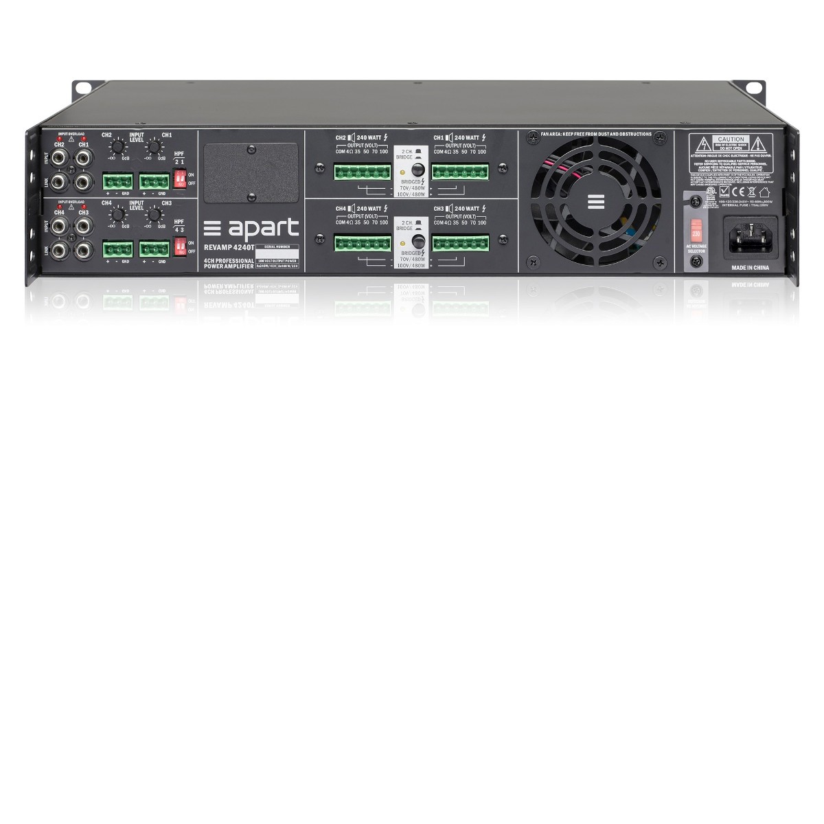 REVAMP4240T is a professional 4-channel digital power amplifier with 4 x 240-watt output power @ 100 volt, but the unit is also bridgeable to 2 x 480 watts @ 100 volt. The unit incorporates a high efficiency SMPS power supply and outputs with efficient Class D output topology.