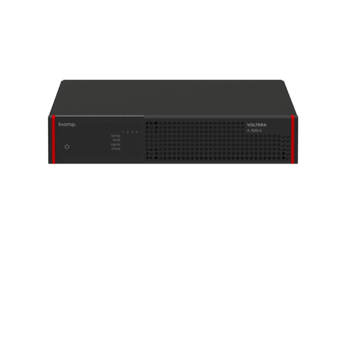 The Voltera A 300.4 is a compact 4-channel half-rack power amplifier with a total output power of 300 Watts. The amplifier channels can be individually selected to drive 75 Watts per channel into 4 ohm, 8 ohm, 70 V, or 100 V. Power sharing is also supported, allowing up to 150 Watts to be delivered by any channel.