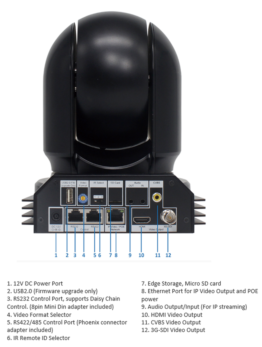 - Video Output Simultaneous: SDI, HDMI, CVBS, IP Audio Input/Output: Audio input x1, Audio out put x1, 3.5mm audio jack