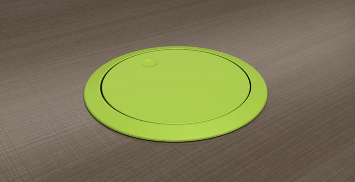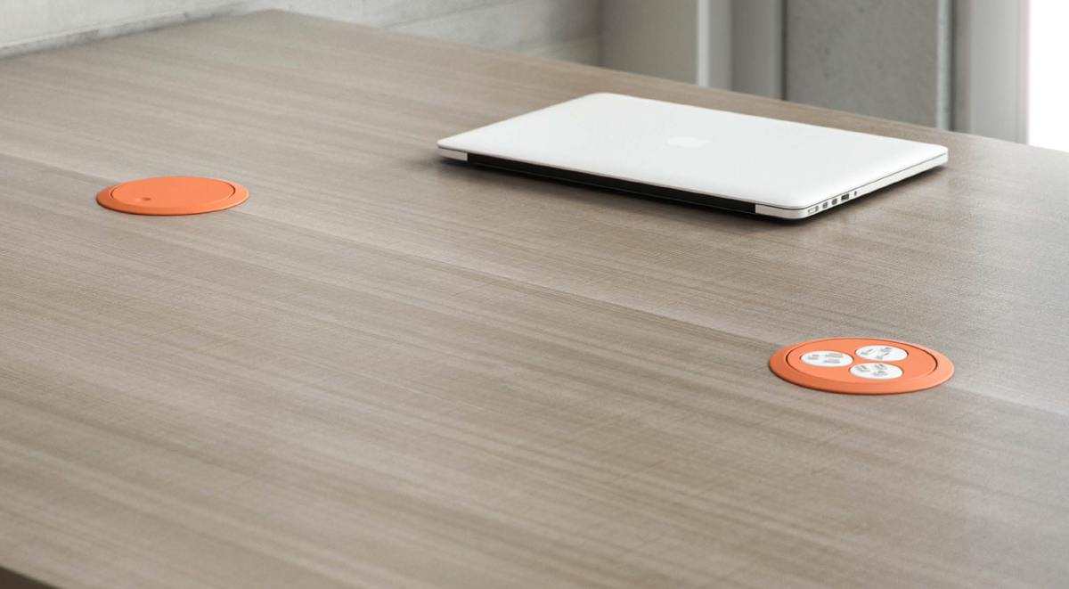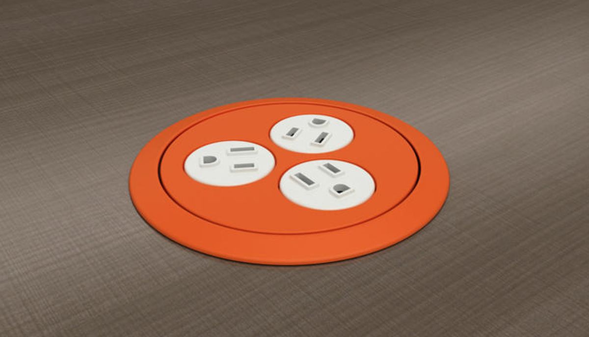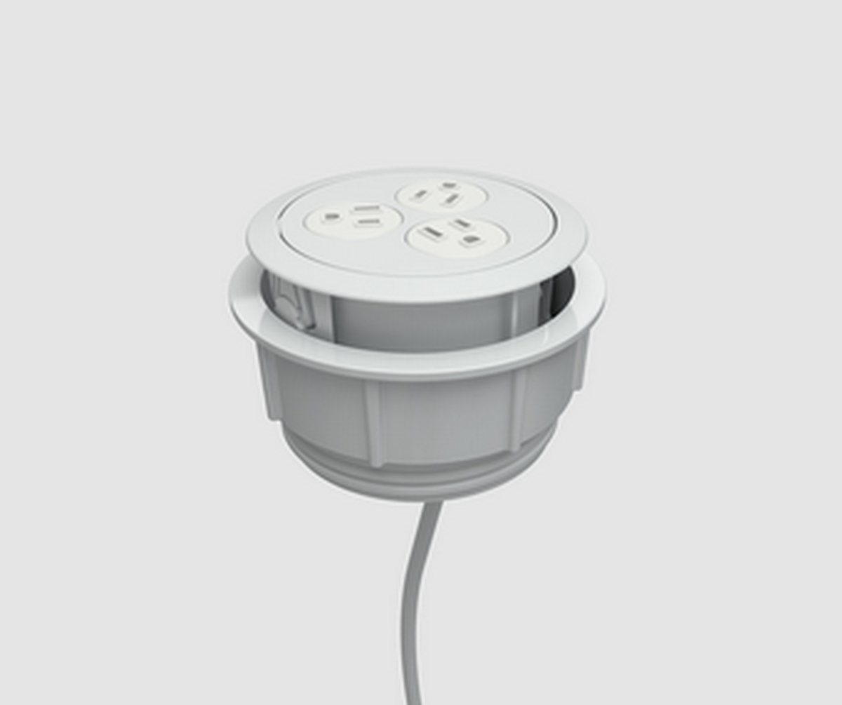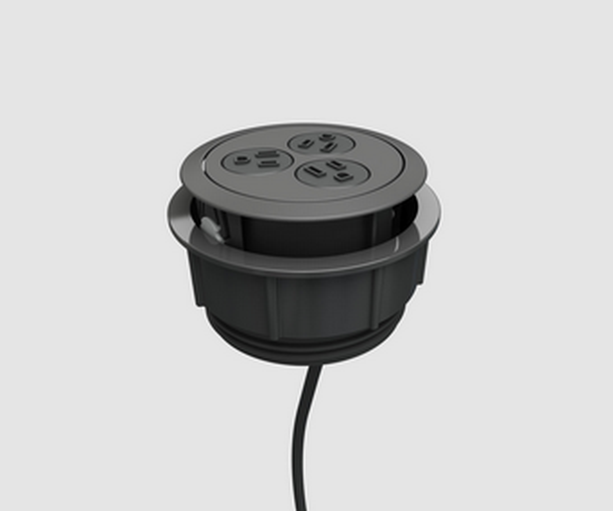 The Byrne Eclipse is a round power grommet that was designed to be stylish yet provide 3 power outlets in your table surface. When closed it looks flush in your table and comes in black, white, and storm grey to compliment any room. To open simply press the soft touch finish and it rotates 180 degrees showing your 3 power outlets.