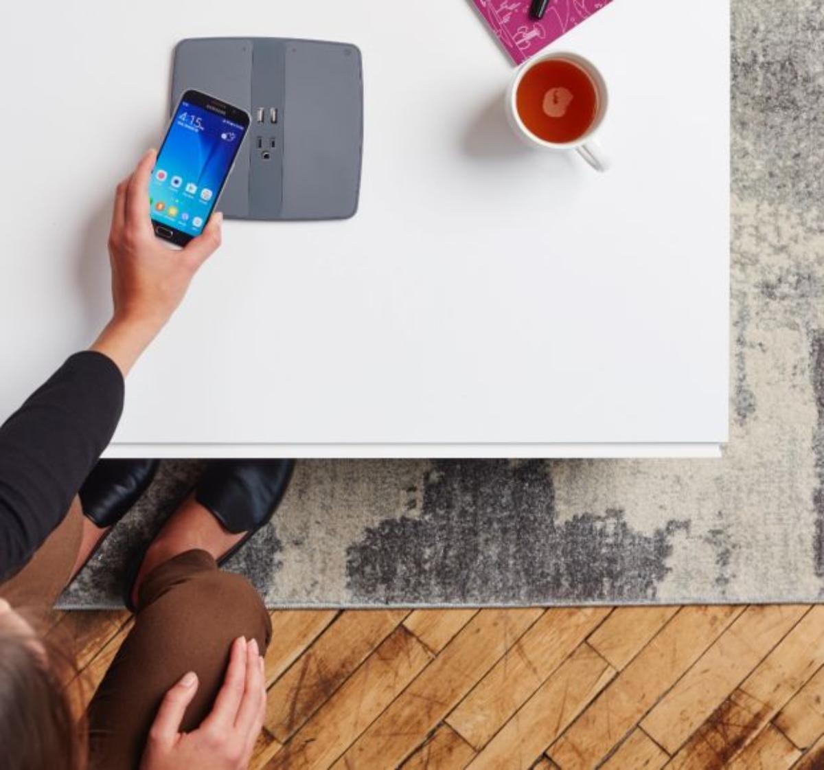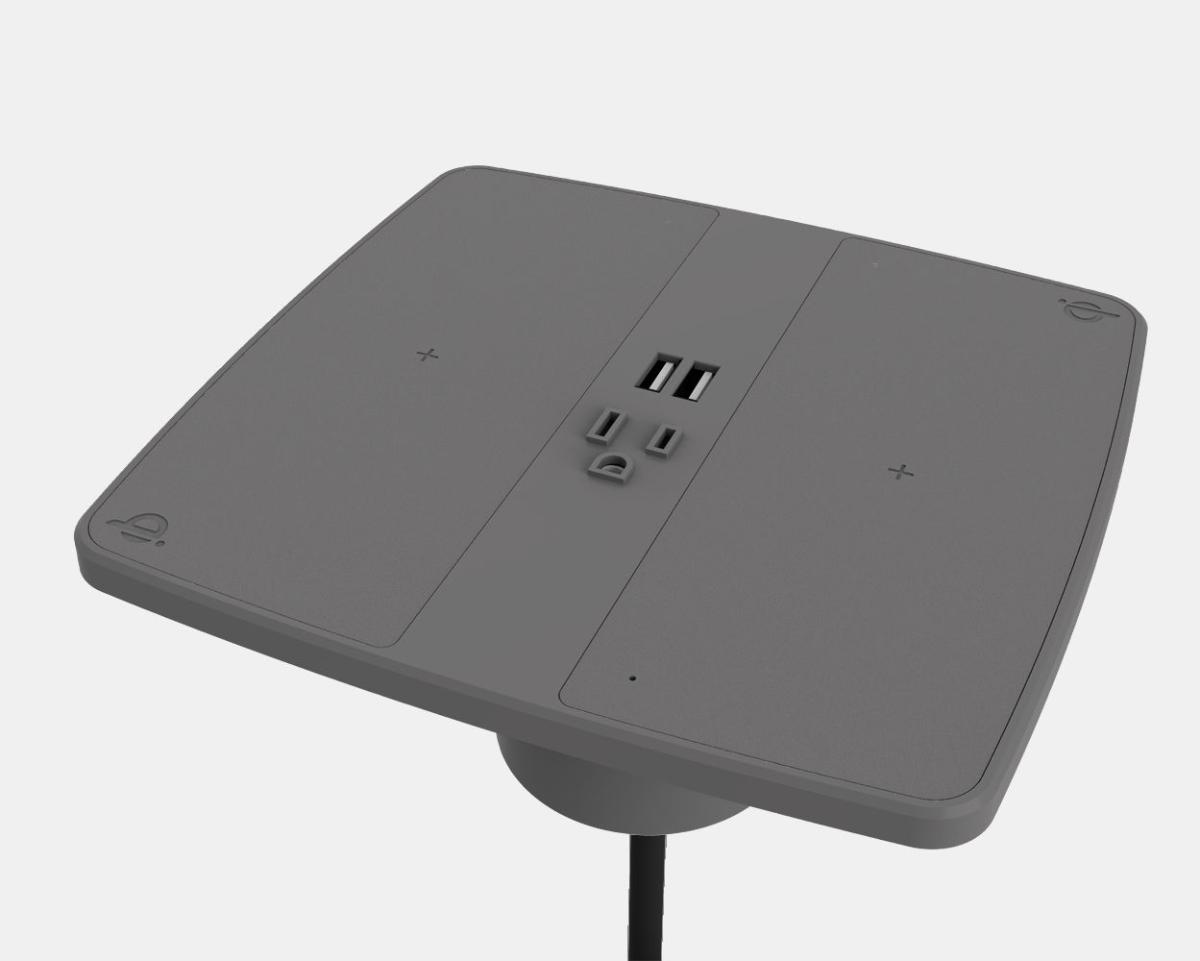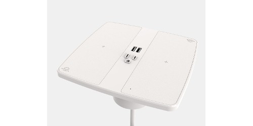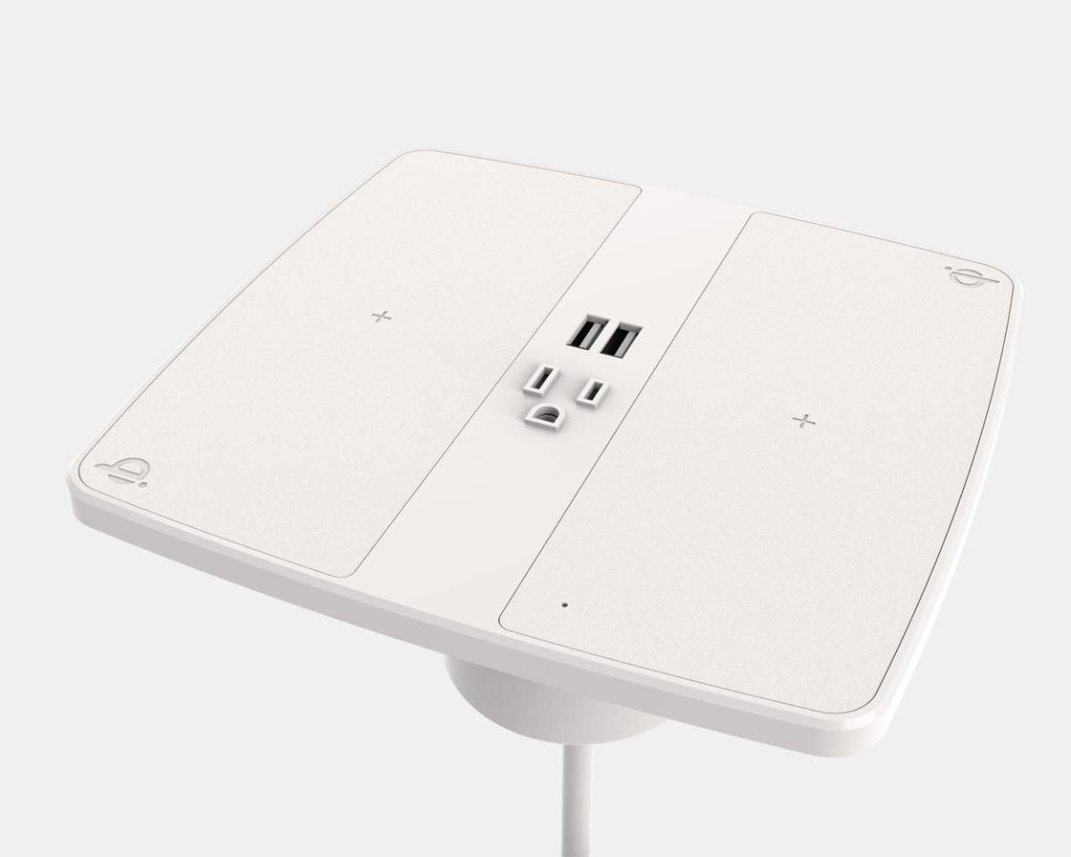 The Byrne HQ2 is a surface mounted table box that provides 2 wireless QI charging pads, 1 power, and 2 USB charging ports. The 2 QI wireless charging pads are 5 watt each QI coils, the USB charging ports provide 2 amps of power on each port. Now you can wirelessly charge a phone, USB ports to power a tablet, and the power outlet to charge a laptop. The middle of the charging pad is glossy while the QI charging pads are a soft touch rubber to keep your phones in place, choose between grey and white color. The HQ2 installs super easy, simply cut a round 3" hole and drop it in and then secure the collar to the underside of your table. Now all you need to do is plug in the single 10' power cord and you are ready to provide 3 different types of charging from an elegant looking power station.