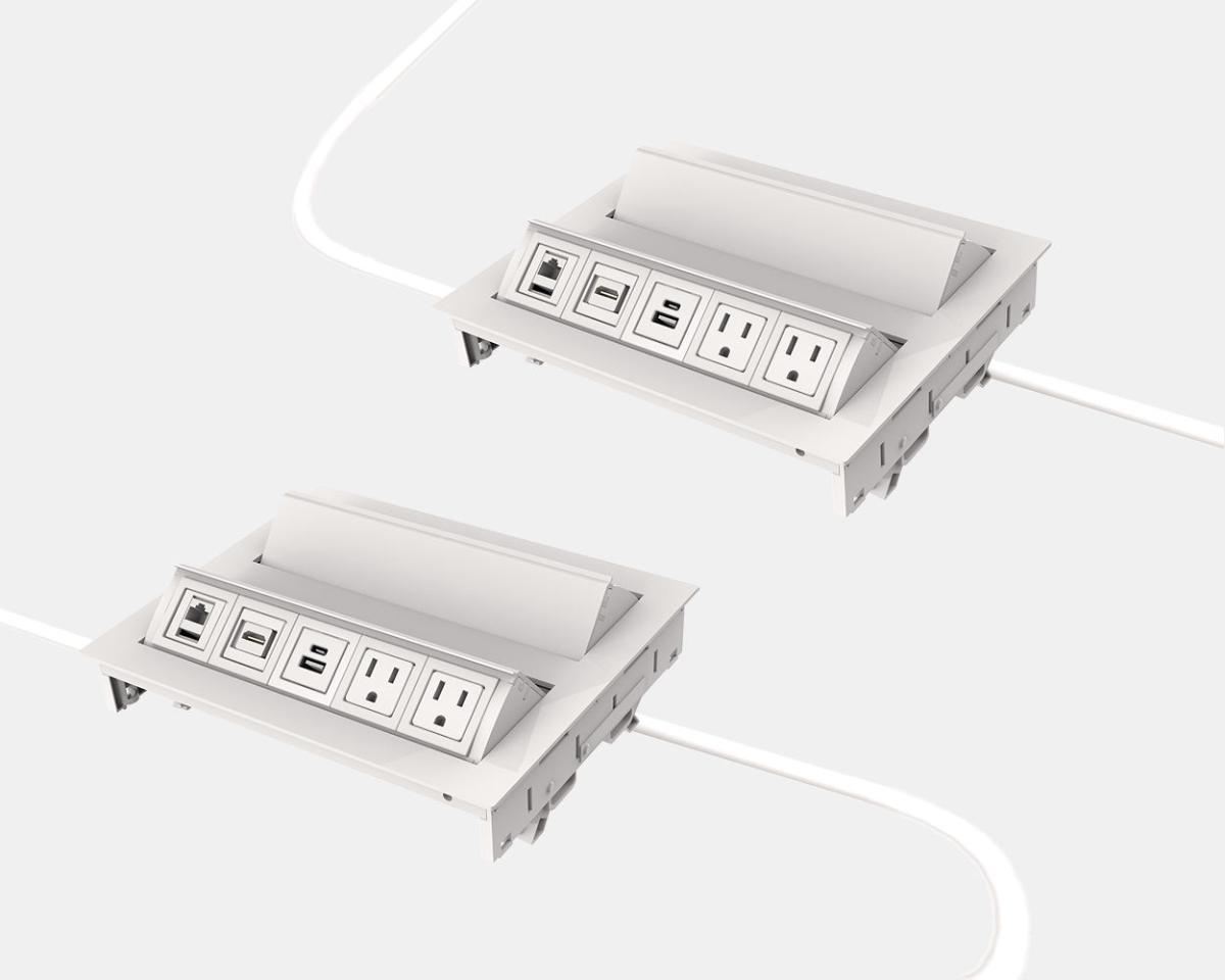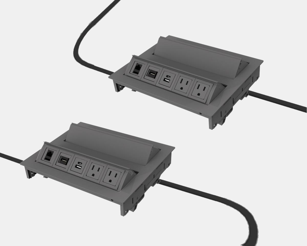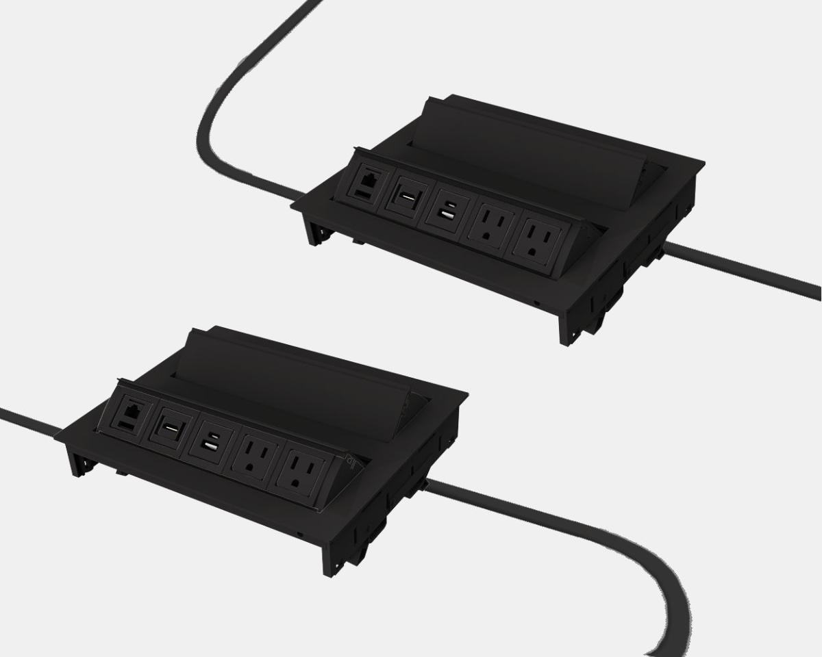 - Each side has the following connections: 2 power with one 10' power cord, dual charging USB (1 of each type A/C), 1 HDMI, and 1 data jack