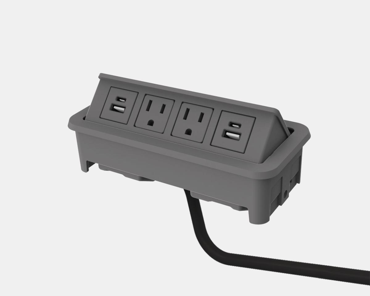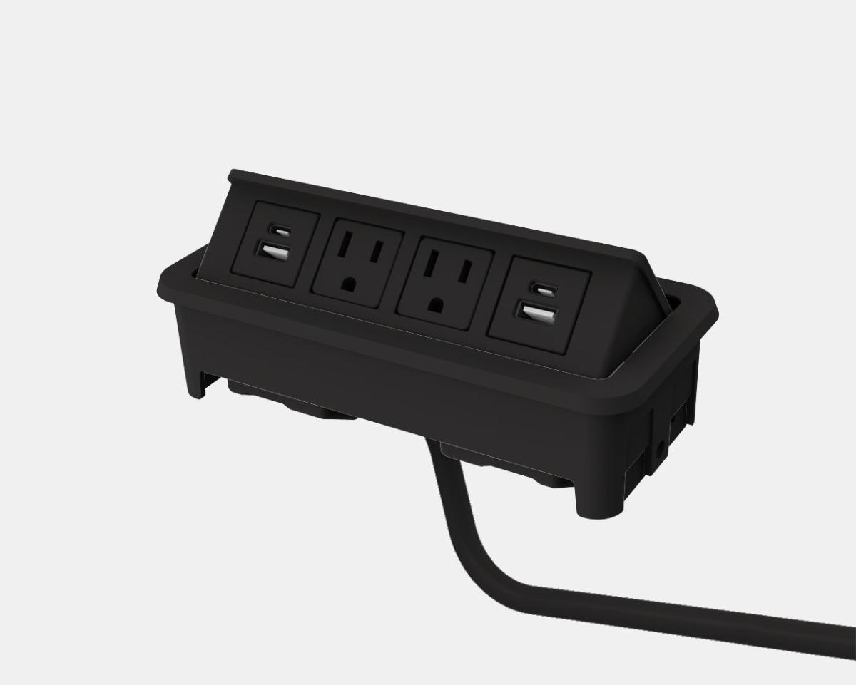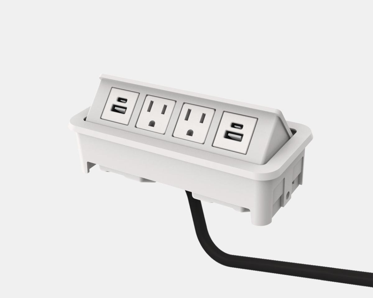The Byrne Nacre is an attractive tilt up style table box that hides two power outlets and four USB charging ports (2 of each type A/C) flush in your table. Choose from modern colors to accent the decor in your room. When you need to start charging simply press the top and the unit will tilt open, when you are done press it back down till it latches closed and flush with the table again.