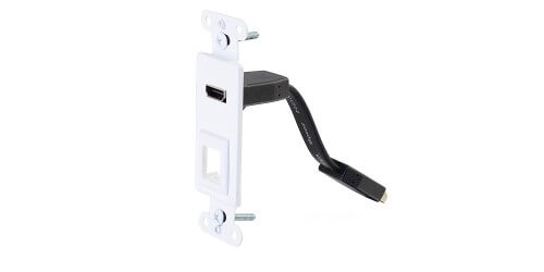 This wall plate is an ideal solution for installations which requires the connection of a HDMI device to a projector through in-wall cabling. This wall plate features flexible HDMI pigtails, making the installation of this wall plate in a wall box easier than wall plates that require use of standard HDMI cables. This wall plate is designed to work with Decora Compatible wall plates and the aluminum construction provides durability and a long life. The keystone allows for the integration of network cabling or telephone infrastructure and will work with most brands of keystone inserts including Leviton®, L-com®, NetKey®, ADC Krone, HellermannTyton, and Allen Tel.