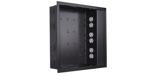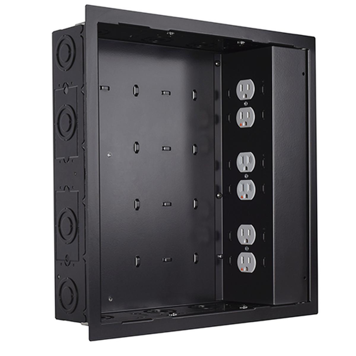The PAC526FBP6 from Chief is black a In-wall storage Box with 6 Receptacle Outlets with Filter & Surge Protection. Designed for use with flat panel display installations to provide an organized, recessed space for routing excess cables. The primary use of this unit is to improve the reliability and functionality of connected equipment by safeguarding the equipment from high energy transients, lightning strikes and electronic noise events that can cause gear degradation and downtime, and took keep excess cables secure and organized through an integrated universal zip tie anchor points.