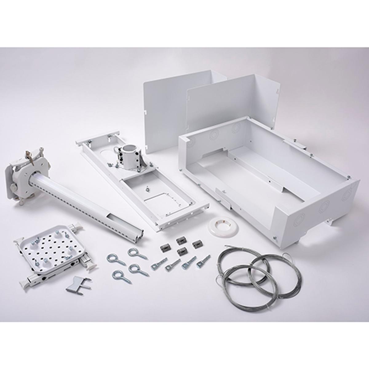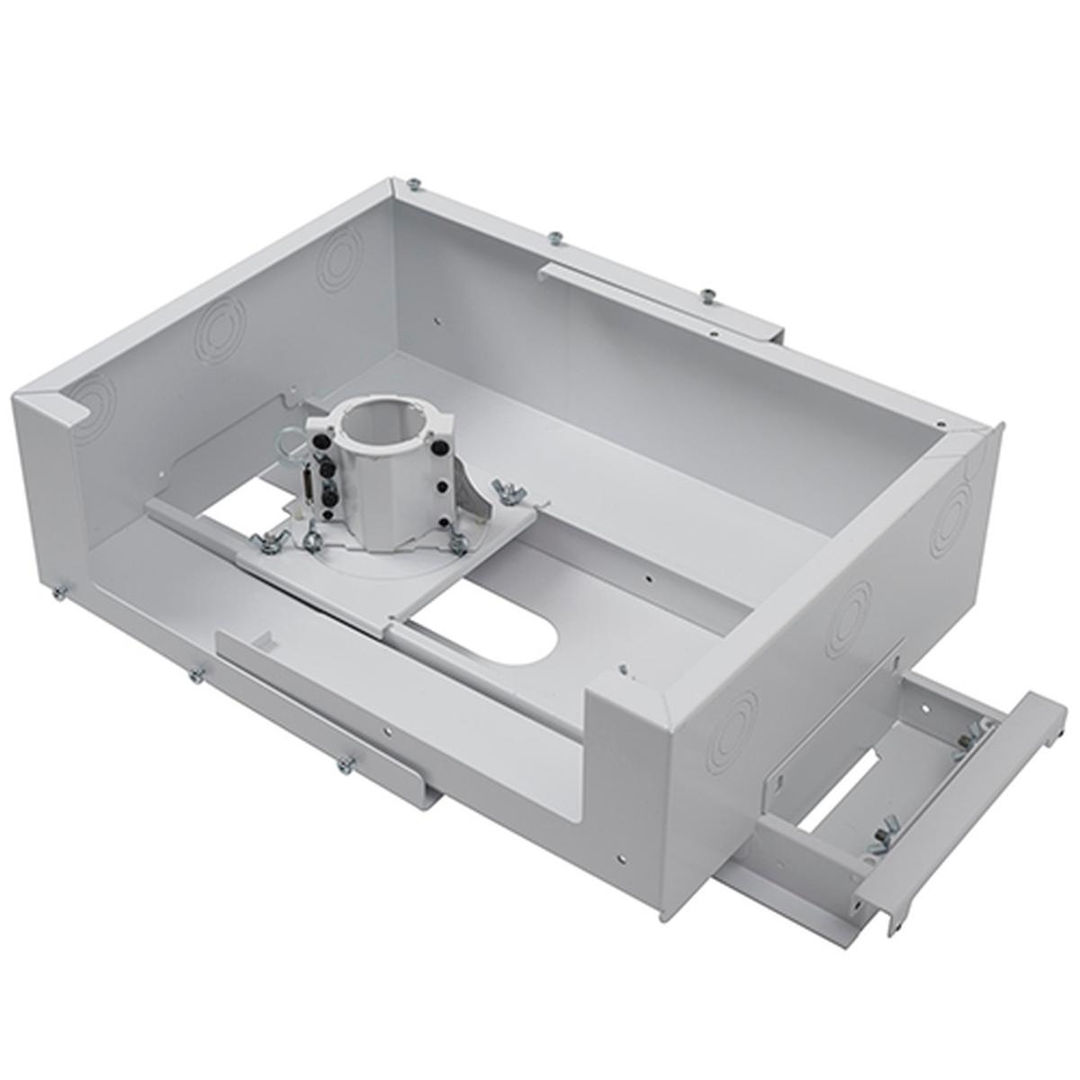 The Chief SYS474UW additionally features a scalable plenum rated storage box that sits above the ceiling tile. The enclosure can be shifted along the tile bridge to avoid plenum interference's, has removable covers that enable side access in shallow plenum spaces and full access from above, and has six trade size conduit knockouts in .5", 1" ,1.5", the flexible conduit knockouts allow high voltage conduit to pass through the plenum box when the power is facing in the room below.