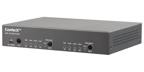 The ConferX 4x2 Matrix is the ideal solution for any conference room, classroom, or huddle space. This 4K switcher can display any four sources through the HDBaseT and HDMI output port. Each of these outputs is entirely independent of each other, allowing to show two sources simultaneously. You will have no problems working with a microphone or intercom system with additional audio inputs and outputs. When you need a stable solution for video distribution, look to the entire line of ConferX products. Extend the reach and versatility of any system with HDBaseT. With two HDBaseT inputs, this matrix switcher works well with two ConferX HDBaseT Wall Plate Transmitters. ConferX Wall Plate Transmitters include video inputs for Mini DisplayPort, HDMI, VGA, or USB-C and can be located up to 100 meters away from the AC-CX42-AUHD. The AC-CX42-AUHD gives end-users a simplified experience and the inputs they need for sharing their ideas even at a great distance. Simple, intuitive, and automatic control makes this unit the ideal "leave in the room" matrix. The unit features an "Auto" option that defaults to the last plugged-in device or simple one-button control for each output. Prefer a control system? No problem, with a built-in web-based GUI and a complete set of management commands, you can make this switch work for you.