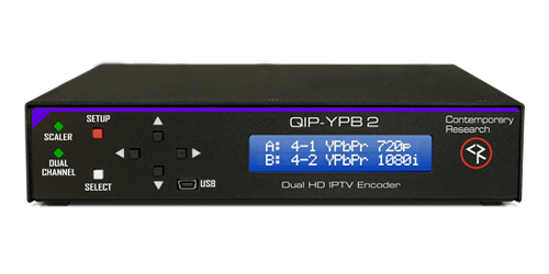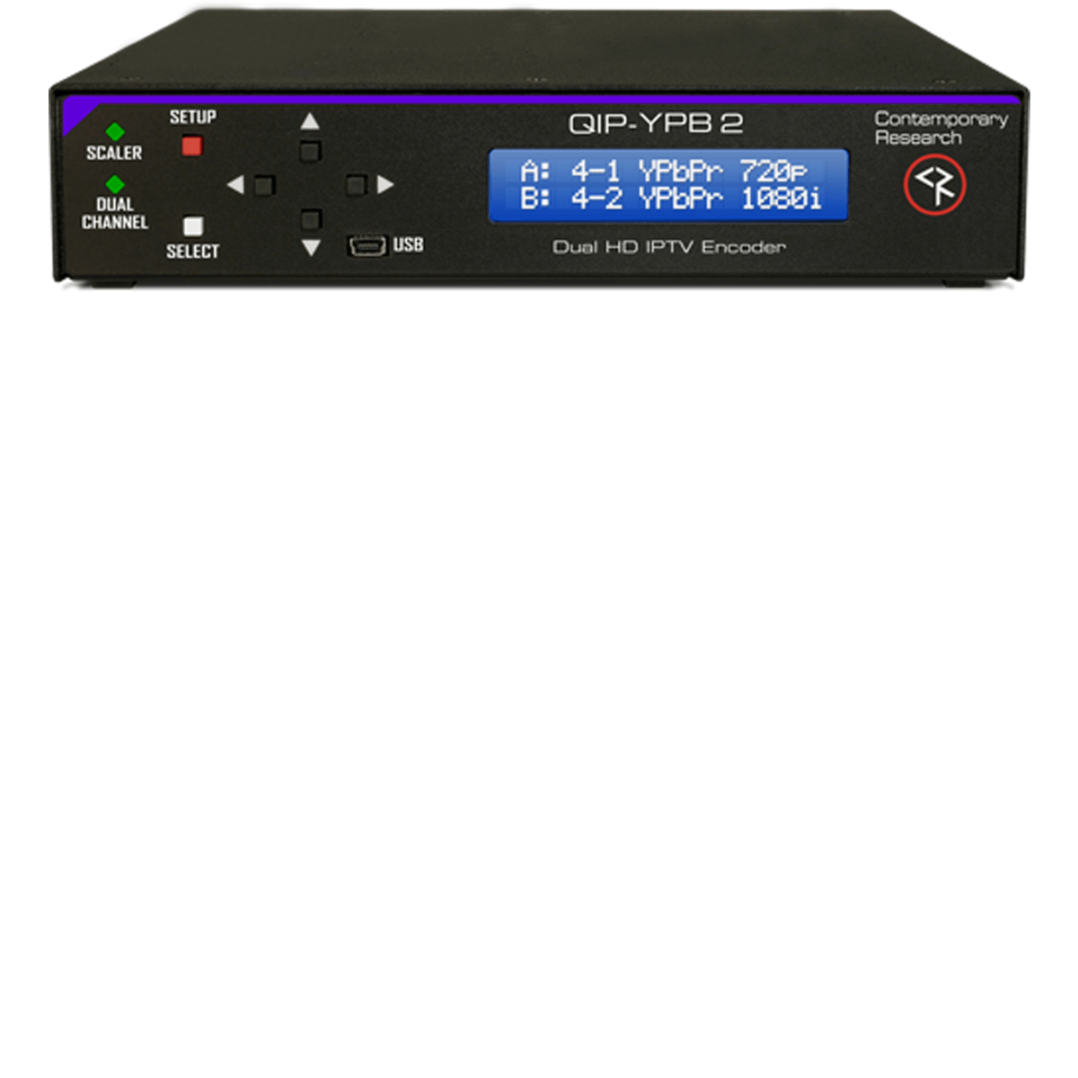 The QIP-YPB 2 IPTV Encoder features dual-channel encoders that create MPEG-2 or H.264 IPTV streams from two separate video sources. It offers low latency, accepts video resolutions from 480i and 1080p, and supports closed captioning. The output can be changed to resolutions between 480i and 1080p using the built-in scalers. The QIP-YPB 2 IPTV Encoder also accepts audio from embedded SPDIF, or analog stereo and can encode AC-3, MPEG-1 Layer 2, or AAC.