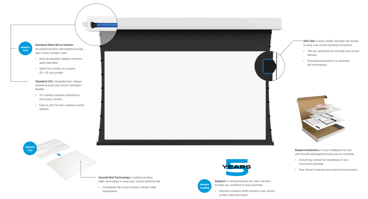 Da-Lite's Tensioned Contour Electrol Series Screens offer an array of industry leading features in the world of motorized projection screen solutions. This motorized screen system features a standard Silent Drive System, which is an enhanced drive mechanism to keep your screen whisper quiet as it extracts or retracts, as to not interrupt business meetings or classroom discussion. For flexible screen operations there is an integrated low voltage control system which has dry contact closures for 3rd party operation, which equally makes it easy to add Da-Lite's wireless control operation accessories to this device as well. Using a patent pending, industry first, roller technology "Smooth Roll Technology", you can have peace of mind knowing no matter how many times you roll the screen up or down this roller technology will keep your surface perfectly flat every time without the common roller impressions (warping) found in other electronic tensioned screen solutions. The other feature on these amazing electric screens that prevent screen warping is in the tensioning cable system, which not only adds another layer of protection against screen warping, it also ensures an even lateral tension, and the system also uses slim-tabs. Slim-tabs provide for a much lower profile, stronger tab design to keep the screen perfectly tensionsed when it is fully rolled out.