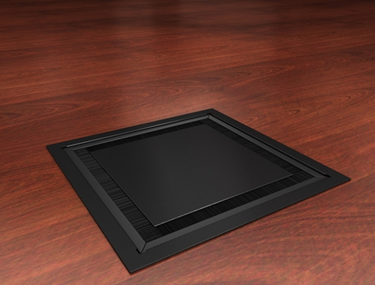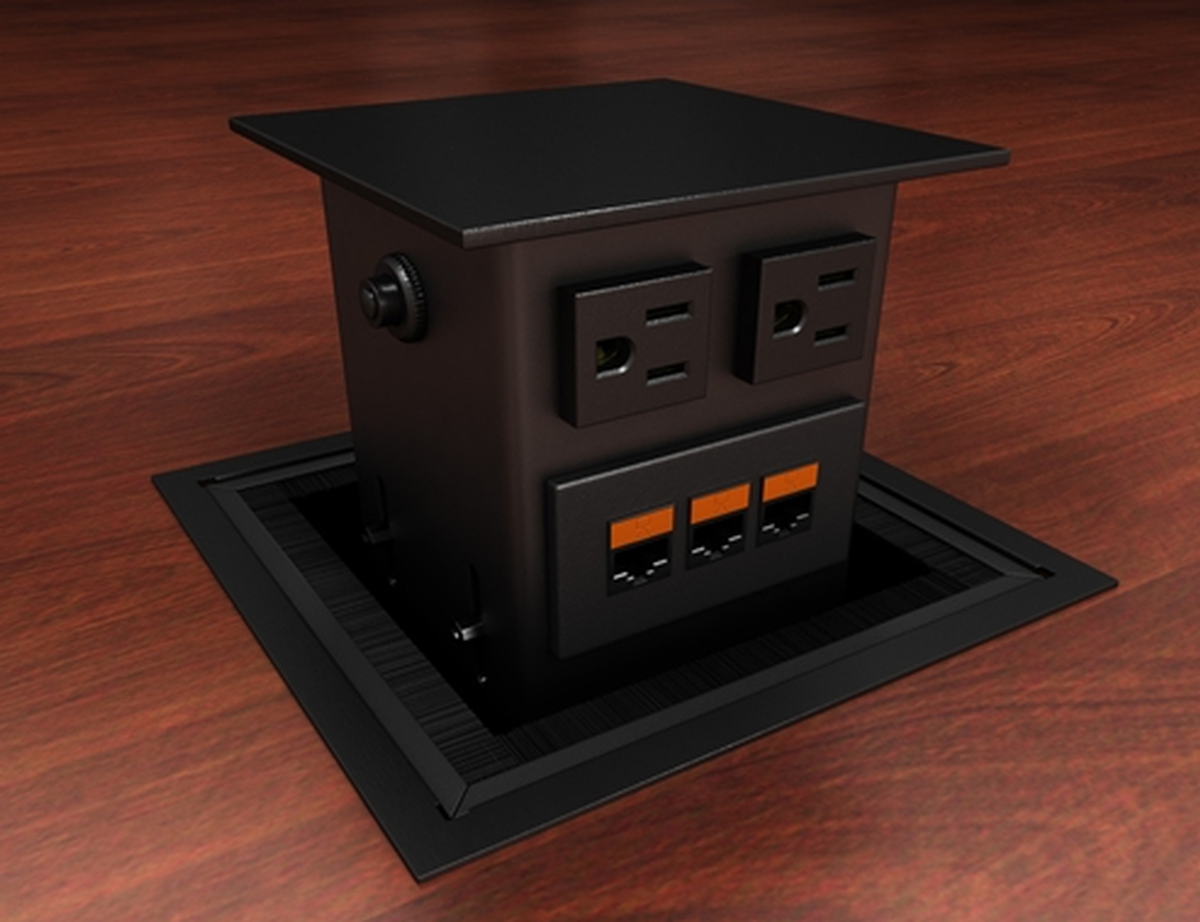 The Concept by ECA is a dual sided pop up box with a square top that has 2 power and 3 data connections on each side. Dual sided pop up boxes have a cool factor as they slowly raise out of the table when pressed however they also serve a purpose, they make accessing your connections from both sides of the table very easy. The concept when installed in the table is flush, when needed just press the top and the spring slowly lifts the unit up. There is a really unique feature that sets this box apart from the competition, the cables can remain plugged in with the unit closed. There is a small gap around the lid that allows cables to remain plugged in. The top finish is black anodized aluminum metal.