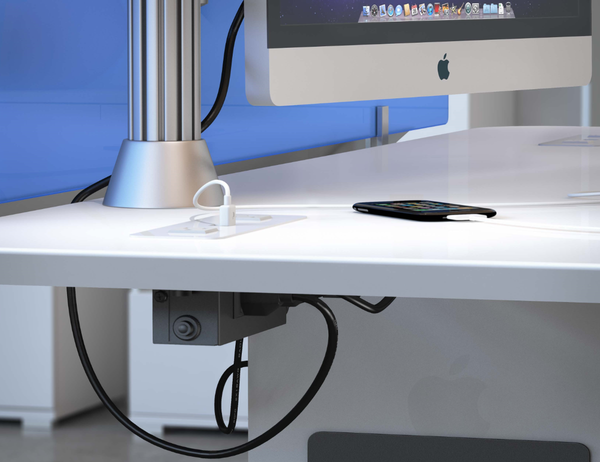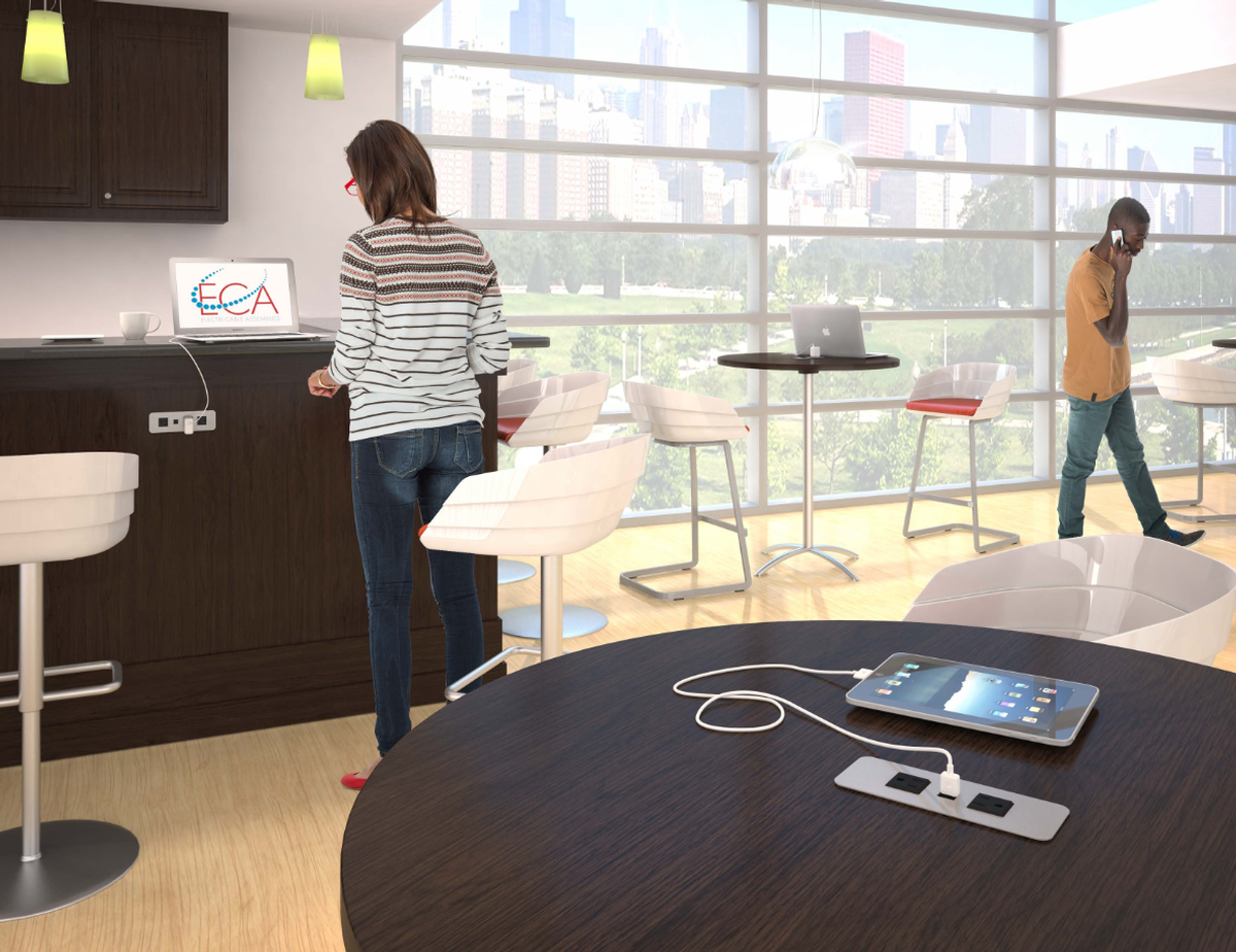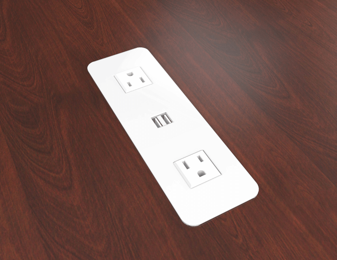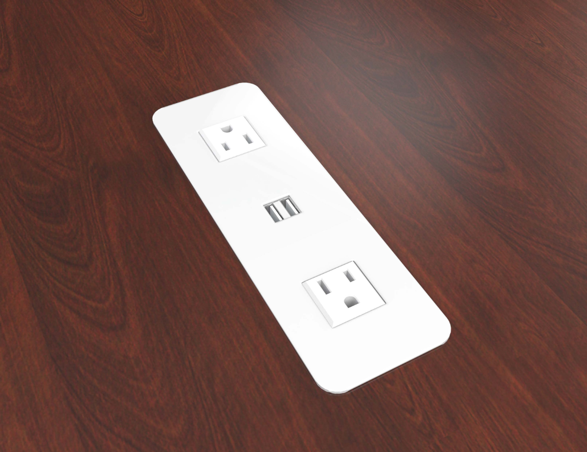 The ECA Cove-USB is a surface flush mount charging station that features two power outlets and two 2.1A USB charging ports. On the underside of the unit is also 2 power outlets, perfect for plugging in lamps or anything that needs power that you don't want taking up cord space on your table or desk. The power outlets are spill resistant so you do not have to worry about having exposed outlets on a flat surface. The Cove-USB is stylish and has 5 color options to choose from including; powder coat silver and black, bushed aluminum silver and black, and gloss white.