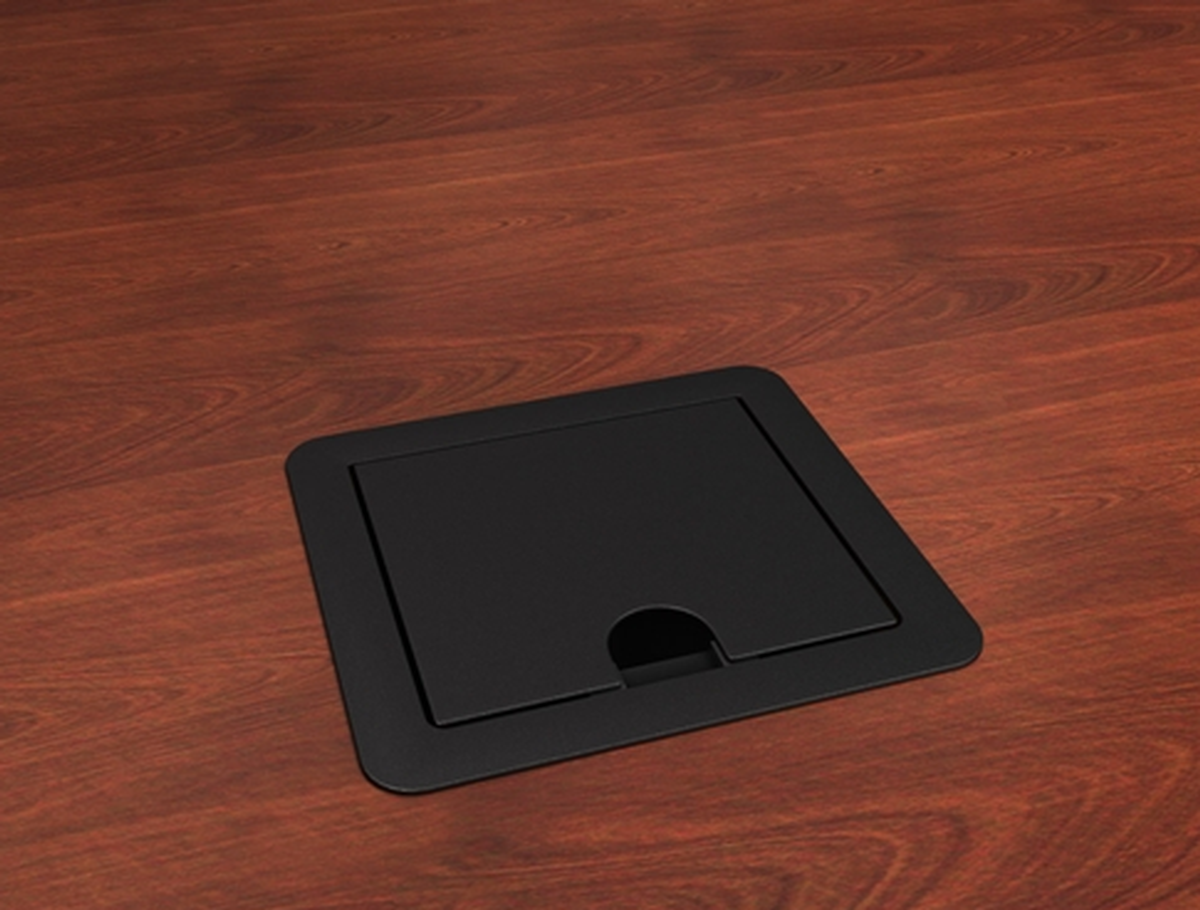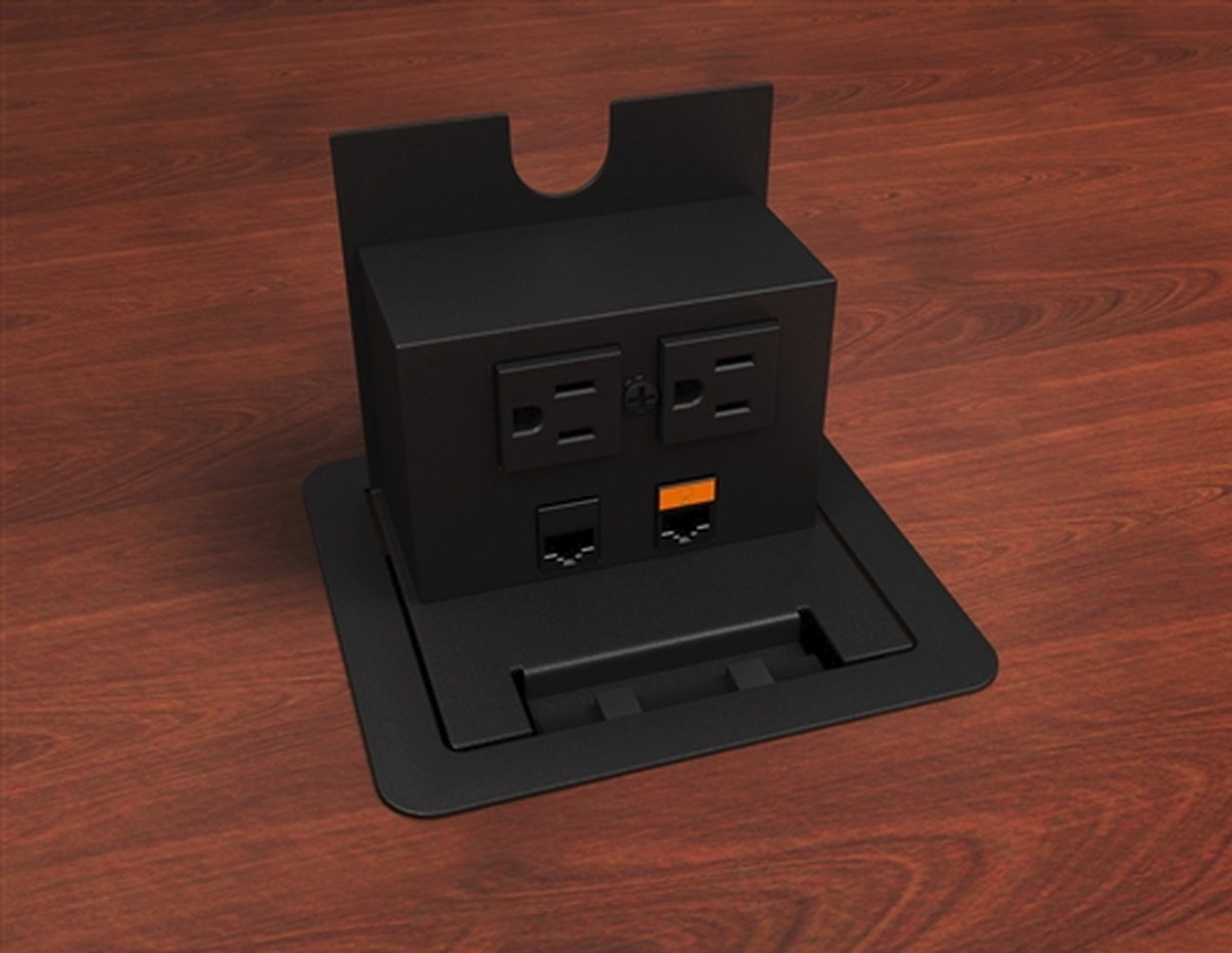 The ECA Interact JR is a flip up style table box that conceals 2 power and 2 data connections, when not in use it is flush with the table yet when needed just flip it up. The Interact JR is an affordable way to hide your power and data in your table, yet stylish with powder coated black finish. To install cut your hole and drop it in, connect your data and plug in the single 6' power cord.