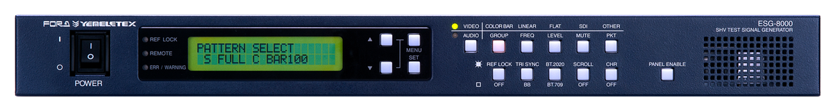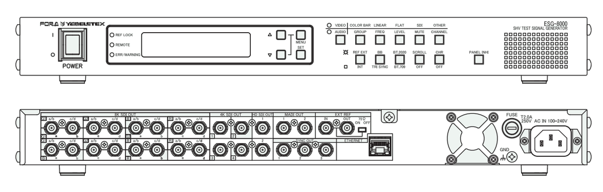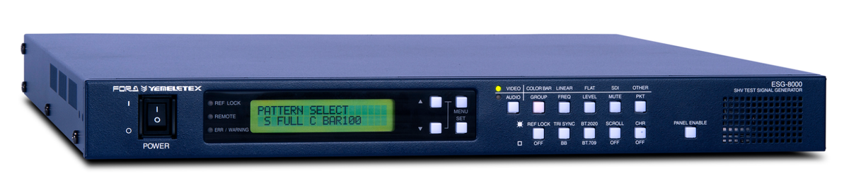 The ESG-8000 from FOR-A is a high-performance 8K/4K/HD Test Signal Generator. This test signal generator is compatible with YCbCr 4:2:2 10-bit FS-SHV (Super Hi-Vision Full Resolution) signals, it also produces DG-SHV (Super Hi-Vision Dual Green) signals. It features standard test patterns that include color bars, ramp, steps, white, black, pathological, crosshatch, multiburst, and noise. There are up to 10 custom test patterns created on a computer can be registered. Additionally this unit offers colorimetry switching, test pattern scrolling, character display, output frame frequency switching, audio test signals, full-featured outputs, payload information multiplexing, reference signal outputs, and external control SNMP monitoring.