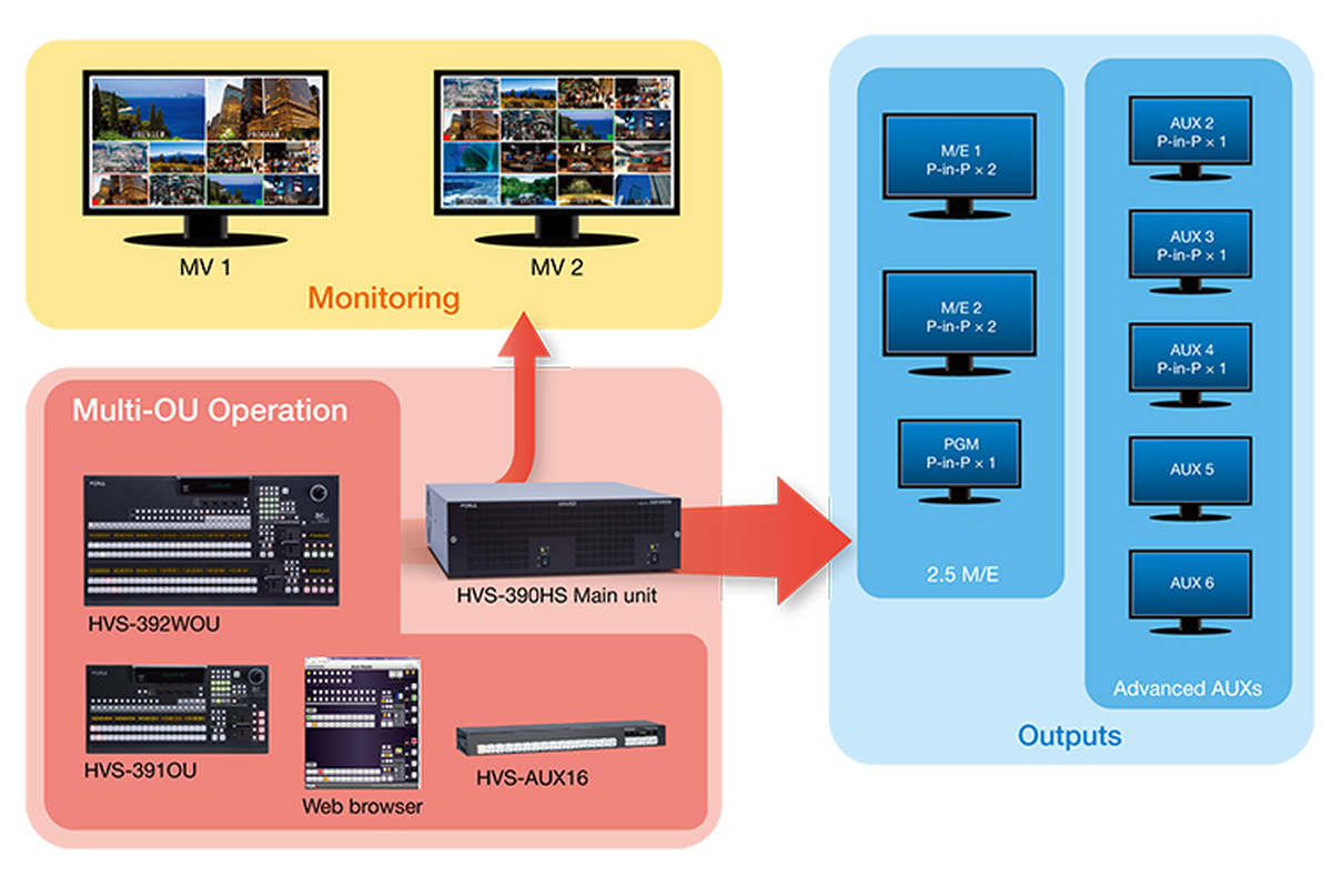 - Freely assign up to 4 x keyers to an AUX output or M/E output (2 from M/E 1, 2 from M/E 2)