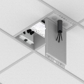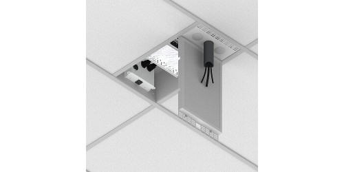 The CB-12P+ is a 1 x 2 enclosure with the addition of an industry-standard 1½ NPT fitting to hang up to a 50 lbs. projector (including mount) while also supporting a maximum load of 50 lbs. on the shelf. Pole mount units include decorative pole rail cover plates, and a solid door is available on all models to eliminate the need to cut ceiling tiles. This female pipe fitting may be mounted in any of 3 predetermined positions and trimmed with the included plates, or if finer pole adjustment is needed, ceiling tile may be cut to size.
