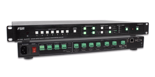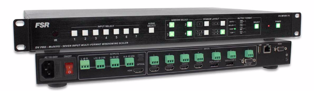 The FSR DV-MFMV-74 is a unique switcher and scaler in that it also provides rapid seamless windowing up to quad screen. Also integrated is audio extraction out so you can send to your rooms amplifier.