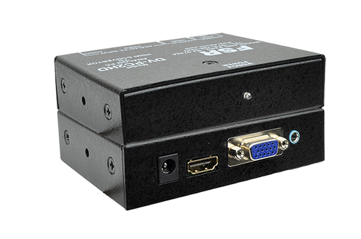 The FSR DV-PC2HD is a VGA and stereo audio to HDMI converter, it converts your PC resolution signal into an HDMI signal with embedded audio. It features a power LED and includes a power supply. To install all you have to do is plug in your cables, there are no adjustments necessary. The signal resolution at the HDMI output is dependent on the VGA input resolution.
