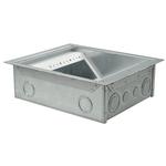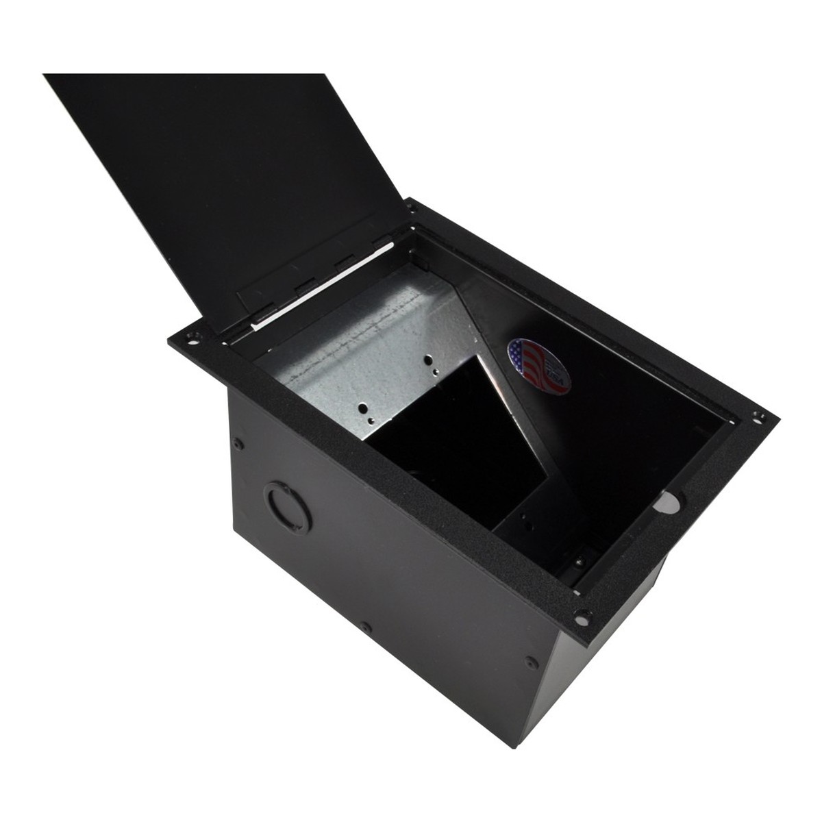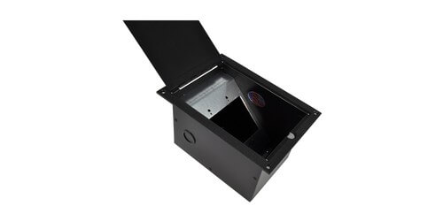 The FSR-1300-BLK is a raised access floor box used in applications such as stage and computer floors, it also features a black sandtex painted hinged cover. The cover completely opens when needed but also has a small door for when cables are being used. It features a duplex cutout for your power and audio video needs. The box is rugged, the one piece all welded design will hold up to the rigors and foot traffic.