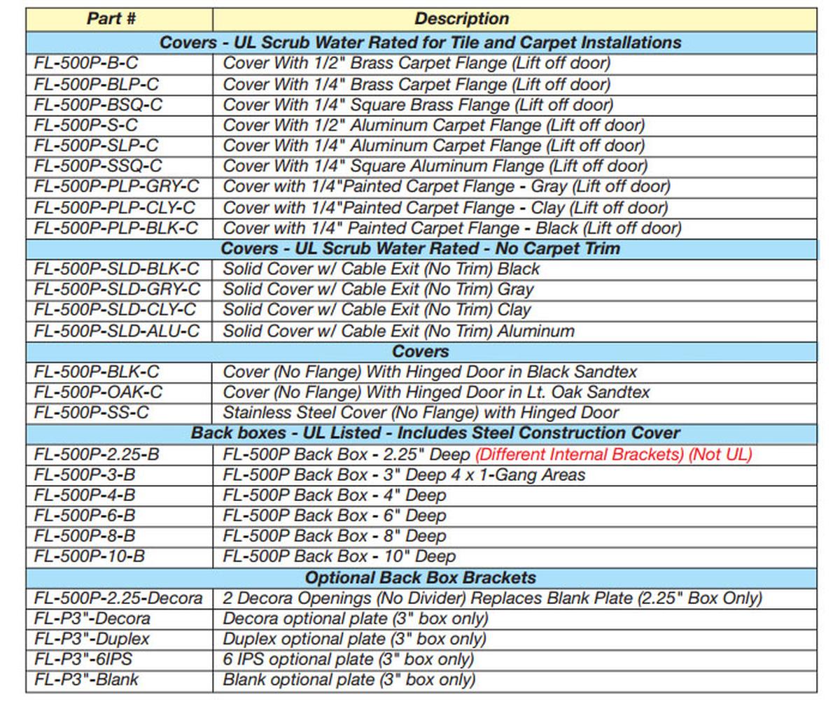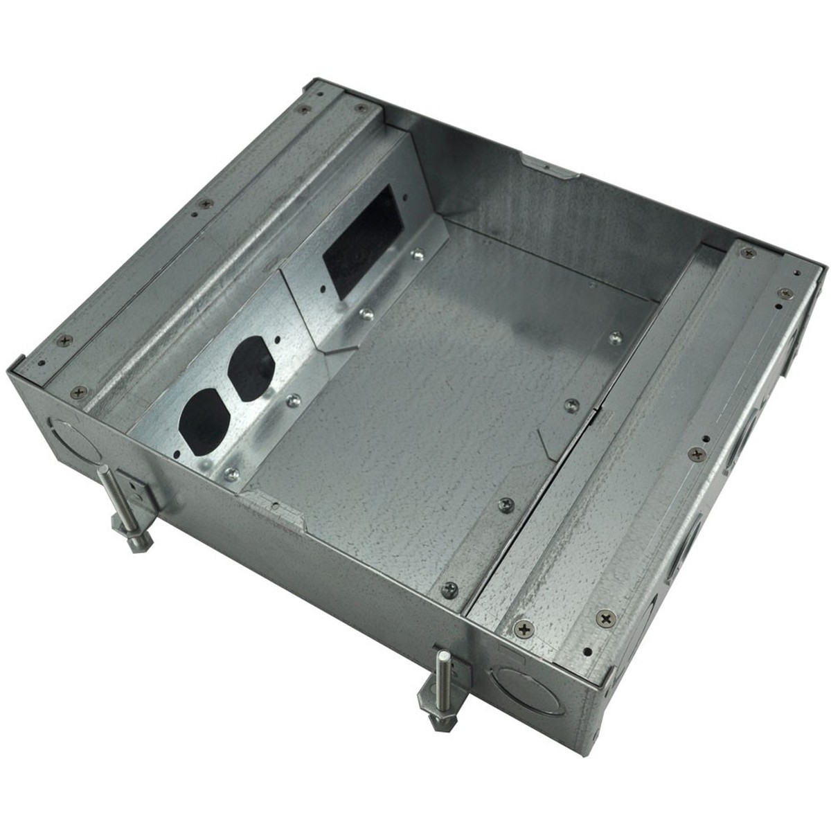 The innovation continues to the transformable back box. The FL-500P's internal brackets can be arranged to provide numerous options for both high and low voltage standard gang openings making it the most flexible and easiest to install floor box available.