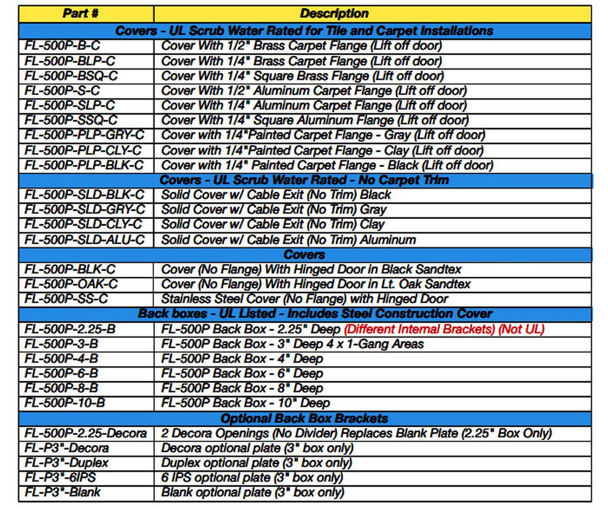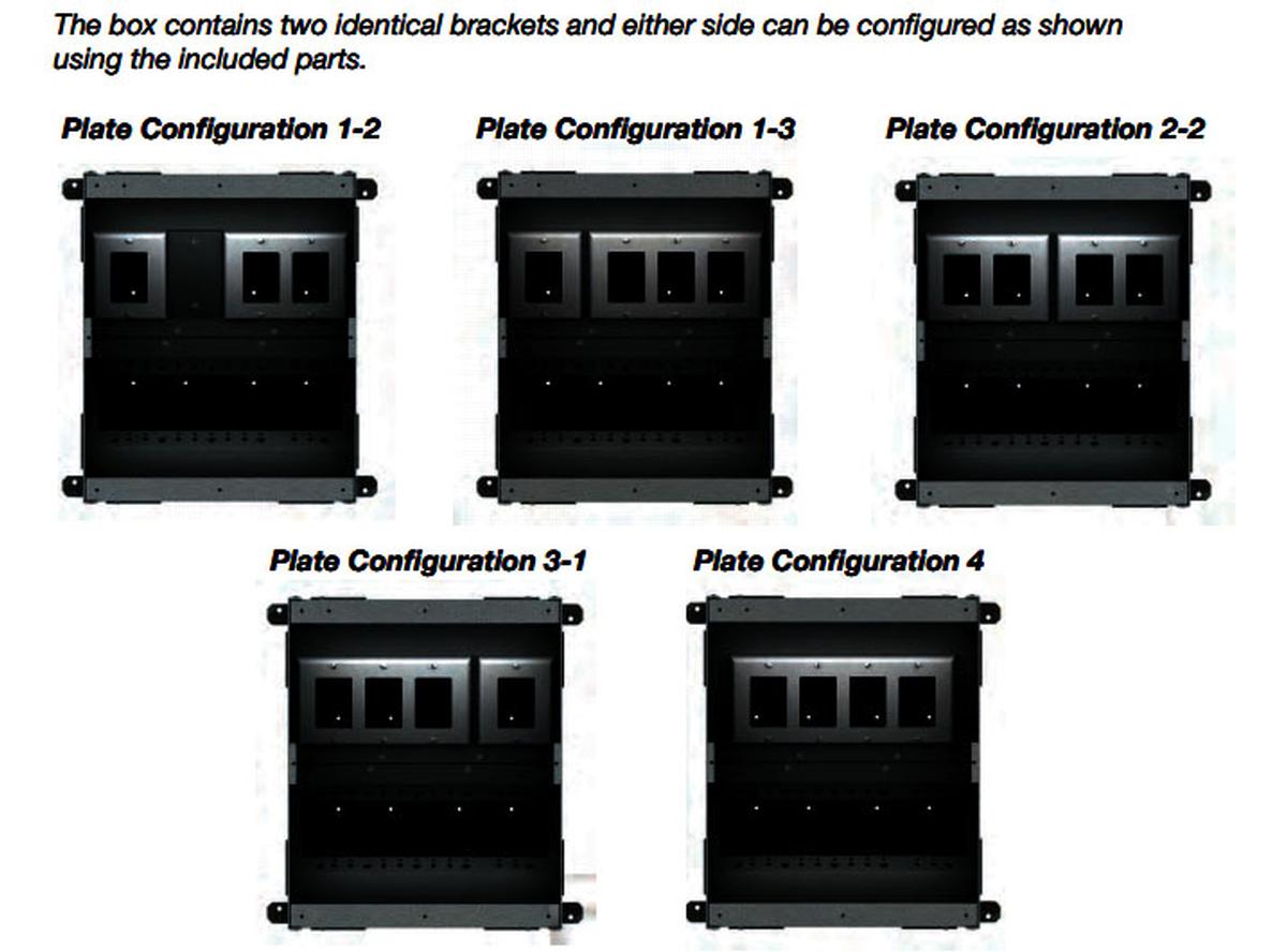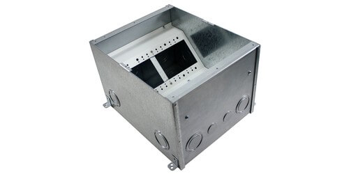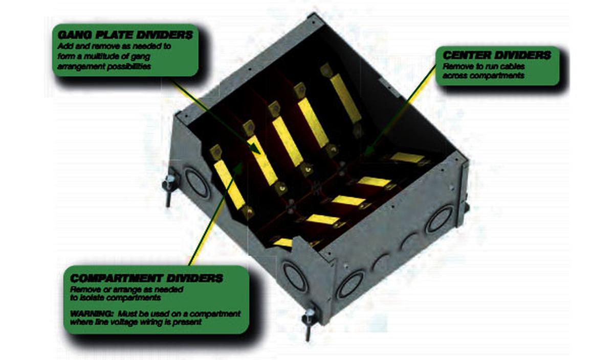 The innovation continues to the transformable back box. The FL-500P's internal brackets can be arranged to provide numerous options for both high and low voltage standard gang openings making it the most flexible and easiest to install floor box available.