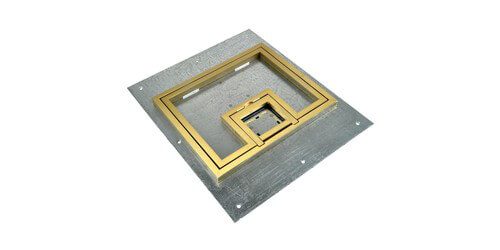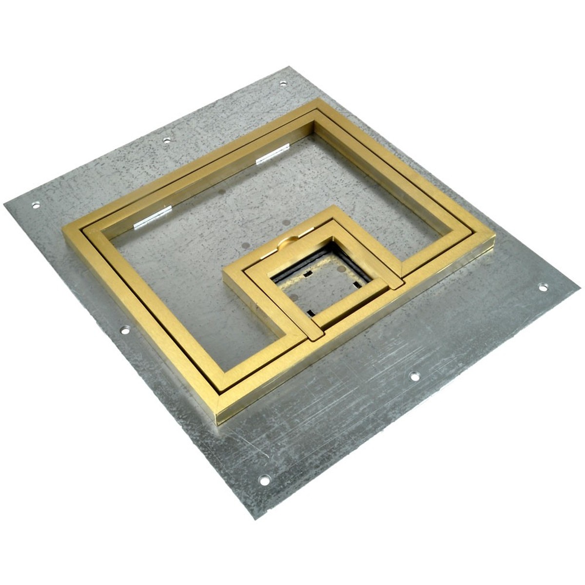 The FSR FL-500P-B-C is a UL scrub water rated for tile and carpet installations brass cover for the FSR FL-500P series floor box. The lift-off section of the cover allows full access to internal connector plates and stored cables. The hinged cable exit door flips back to allow the cover to remain in place after connections are made and cables are routed through it.