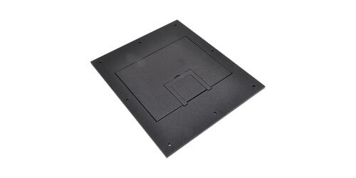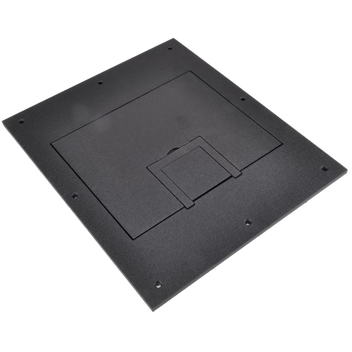 The FSR FL-500P-SLD-BLK-C is a UL scrub water rated no trim solid black cover for the FSR FL-500P series floor box. The lift-off section of the cover allows full access to internal connector plates and stored cables. The hinged cable exit door flips back to allow the cover to remain in place after connections are made and cables are routed through it.
