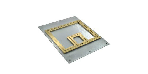 The FSR FL-540P-BSQ-C is a UL listed square cover for the FL-540P floor box, it comes with a 1/4" brass carpet flange. The lift off section of the cover allows full access to the internal cables and connector plates. A smaller hinged trap door folds back to create the cable exit.