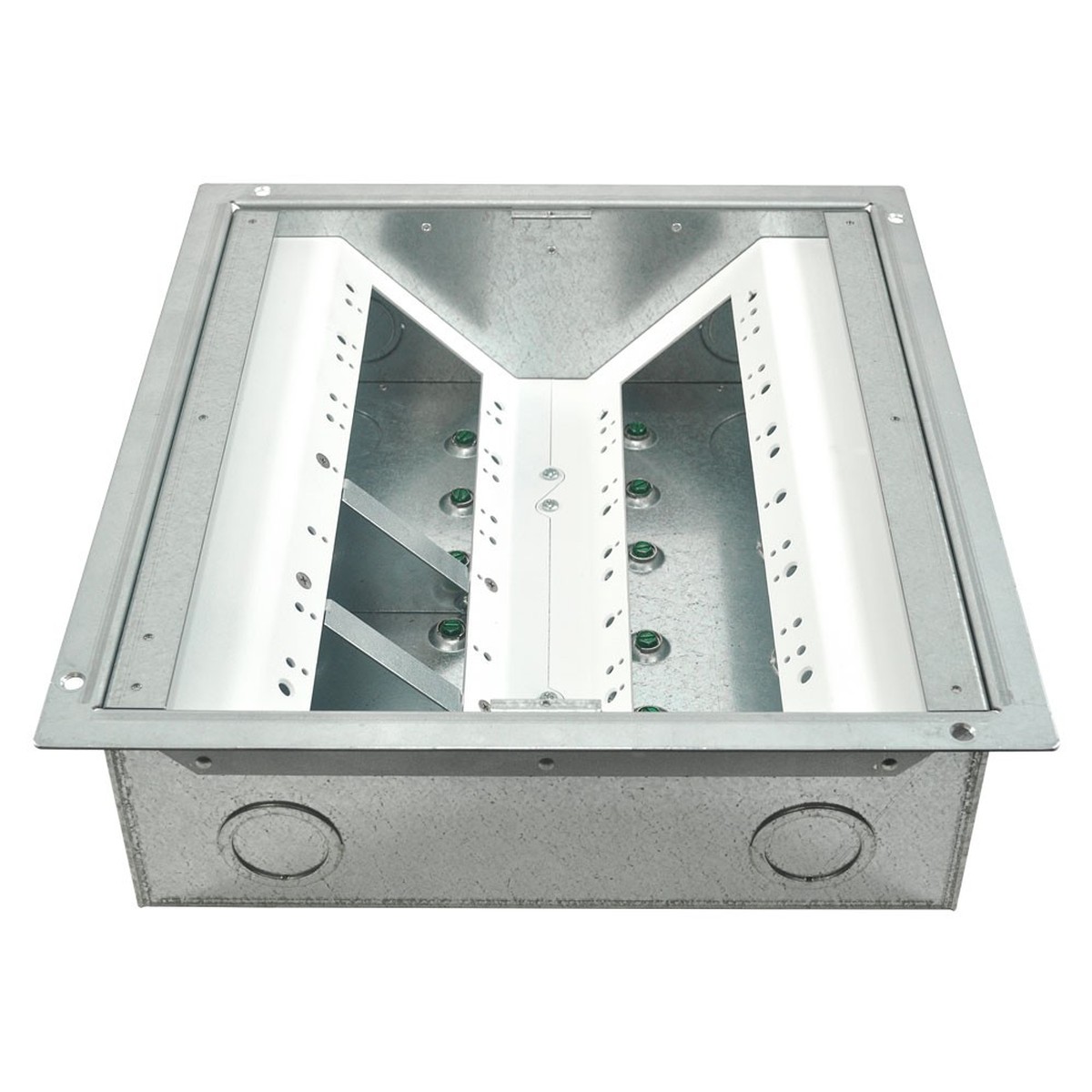The FSR FL-640P-4-B is a large 4" deep floor box suitable for raised access carpeted floors with its support lip. Use for cable storage and also configure with desired plate, power, data, and audio and video connections to suite your needs. The adjustable back box has numerous configurations possible simply by adjusting the internal brackets. To install cut your hole and drop the floor box in, the rugged lip will support the unit and installs flush with the ground. The unit comes with a temporary construction cover, order the cover that best fits your needs.
