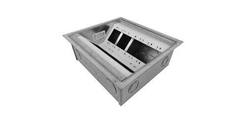 The FL-640P-4 floor box is designed for raised access carpeted floors. This floor box provides a practical solution for cable storage while maintaining easy access. The lift off section of the cover allows full access to the internal cables and connector plates. A smaller hinged trap door folds back to create the cable exit. Cables can be stored within the floor box when not in use, allowing unencumbered travel over the floor. The sturdy drop-in floor lip supports the unit and installs flush with the floor.