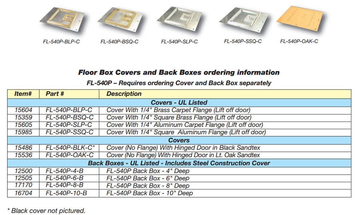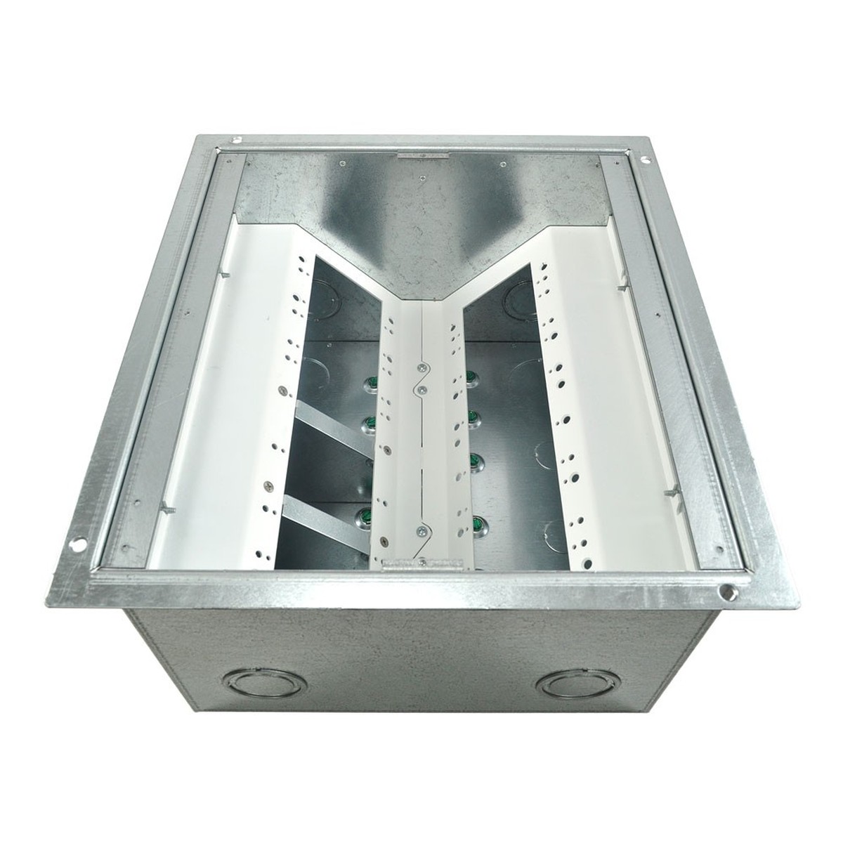 The FSR FL-640P-8-B is a large 8" deep floor box suitable for raised access carpeted floors with its support lip. Use for cable storage and also configure with desired plate, power, data, and audio and video connections to suite your needs. The adjustable back box has numerous configurations possible simply by adjusting the internal brackets. To install cut your hole and drop the floor box in, the rugged lip will support the unit and installs flush with the ground. The unit comes with a temporary construction cover, order the cover that best fits your needs.
