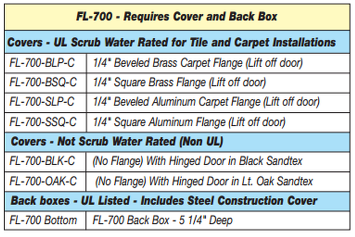 The FSR FL-700-SSQ-C is an aluminum UL scrub water rated square cover for the FL-700 floor box. The lift off section of the cover allows full access to internal cables and connector plates while a smaller, hinged trapdoor flips back to create your cable exit. The cover is made of heavy duty 11 gauge steel and is installed flush in your floor for a clean look. The low profile edging is 1/4" high showing the hand mitered carpet edge.