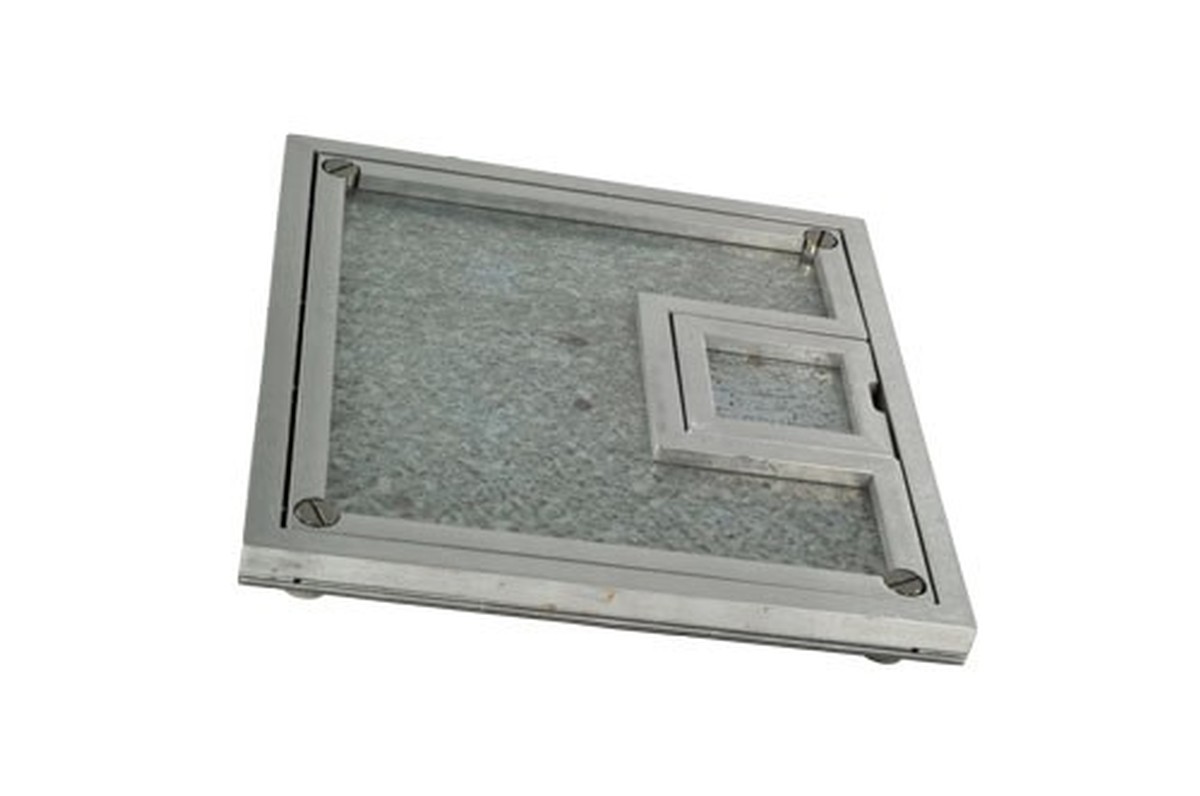 The FSR FL-710-BSQ-C is an aluminum square cover for the FL-710 floor box. It features a lift-off section of the cover that allows full access to internal cables and connector plates while a smaller, hinged trapdoor flips back to create a cable exit. The 1/4" flange is for carpet and tile installations and is UL scrub water rated.