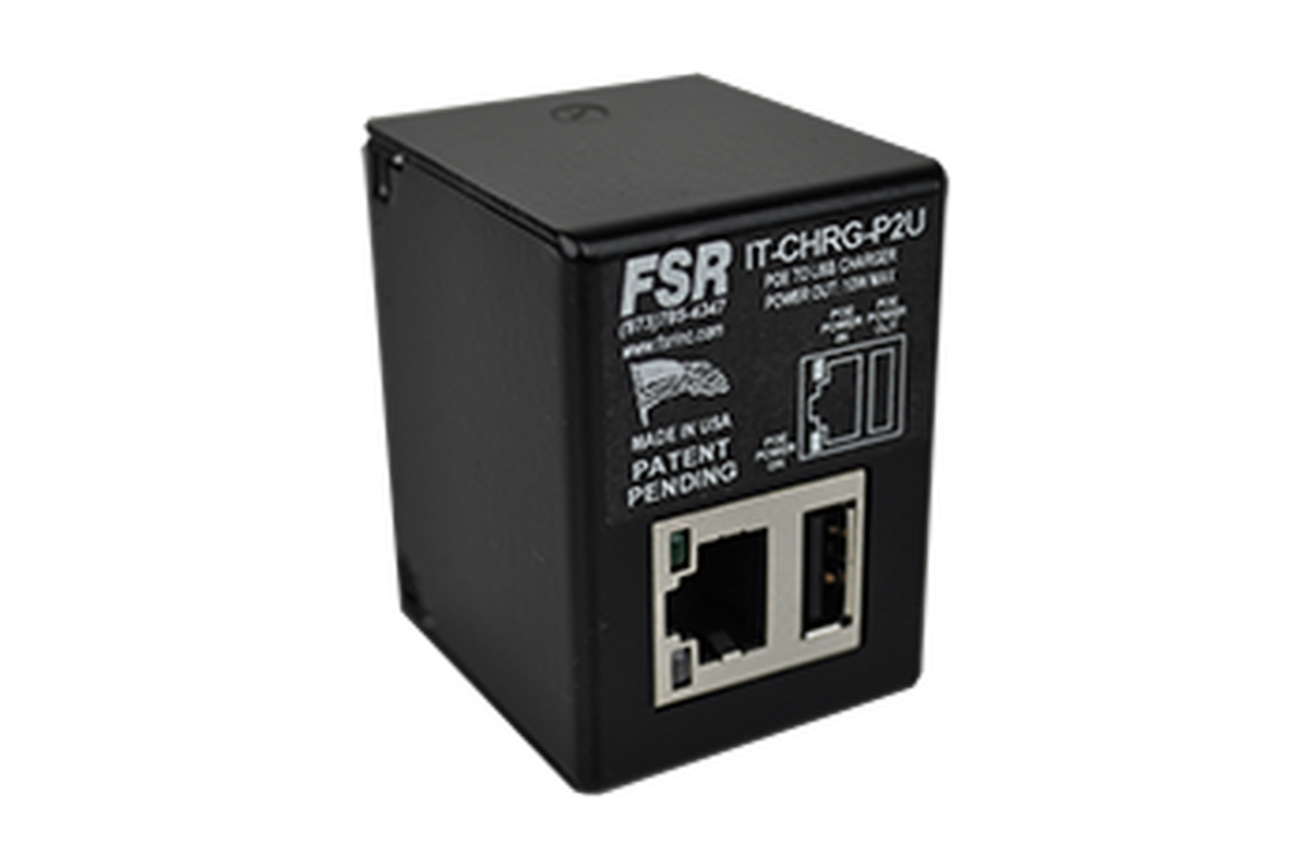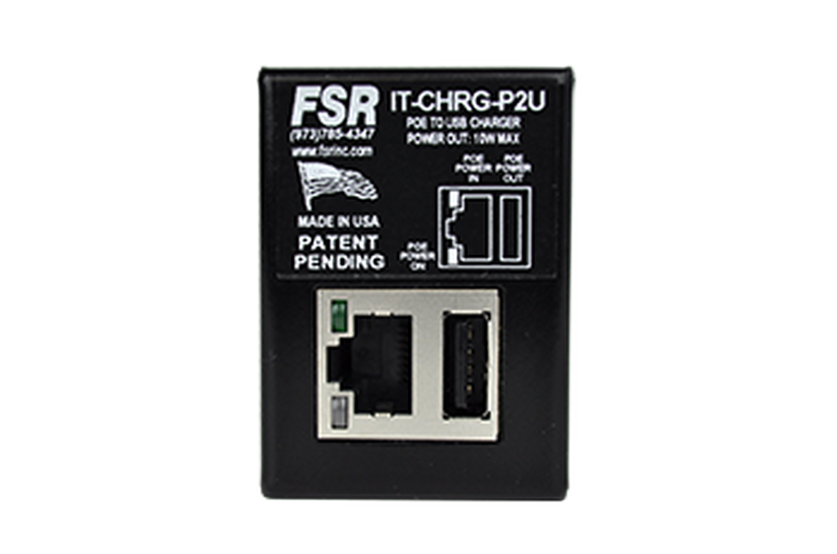 The FSR IT-CHRG-P2U is a Power over Ethernet (PoE) charger for iPads and other devices with a USB port.. Power your iPad without AC power via the USB port, this is accomplished by connecting the IT-CHRG-P2U to a PoE drop.