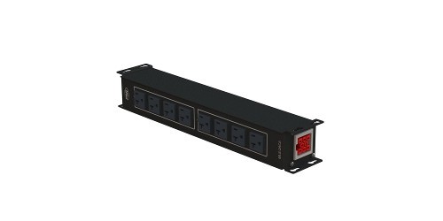 The MLS-2AC8 power distribution box has a male and female connector to allow daisy-chaining. It provides eight 20 amp NEMA 5-20R outlets, each connected to a separate circuit. Two small flanges to allow mounting so power can flow in either direction.