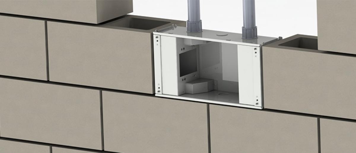 The PWB-CMU8 is the first dedicated Masonry Wall Box engineered for installation in 8” block walls. The all-metal CMU8 is designed to replace the front portion of one block and, with the optional paintable cover, provides an attractive surface with no visible jagged block edges. The box has two opposing 2-gang device boxes inside, providing space for power and low voltage devices, including most receivers.