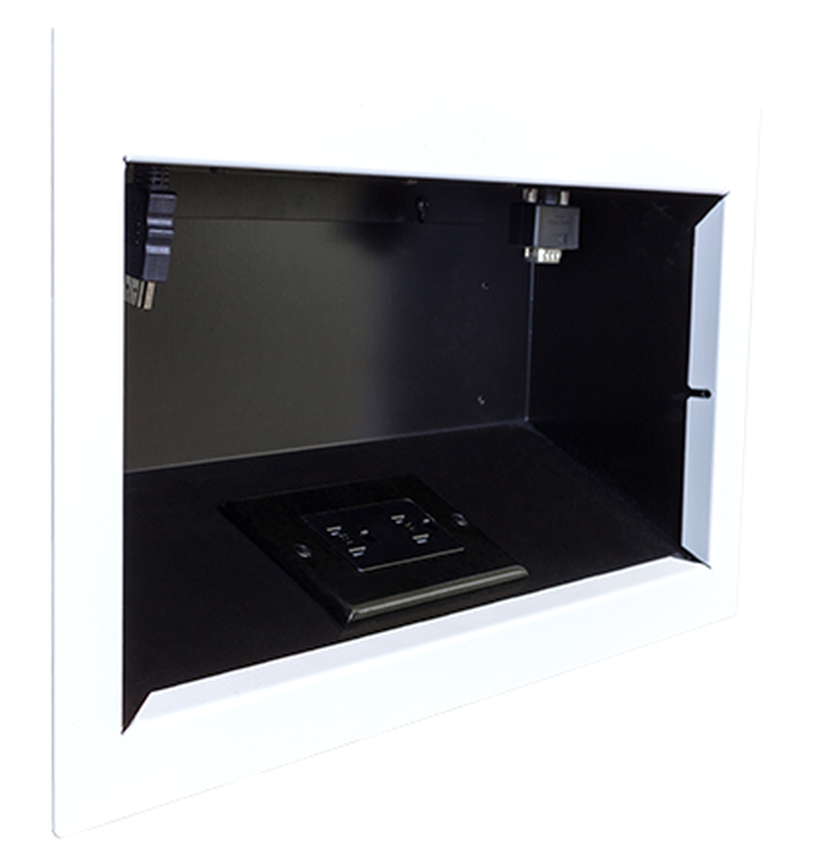 The HuddleVU Wall Box is one of the latest editions to the HuddleVU Collaboration Family. This large opening wall box is designed for use with one or two optional low profile cable retractors (ordered seperately), optional adjustable component shelves (ordered seperately), and optional AC power bracket with (4) 15-amp surge protected receptacles.