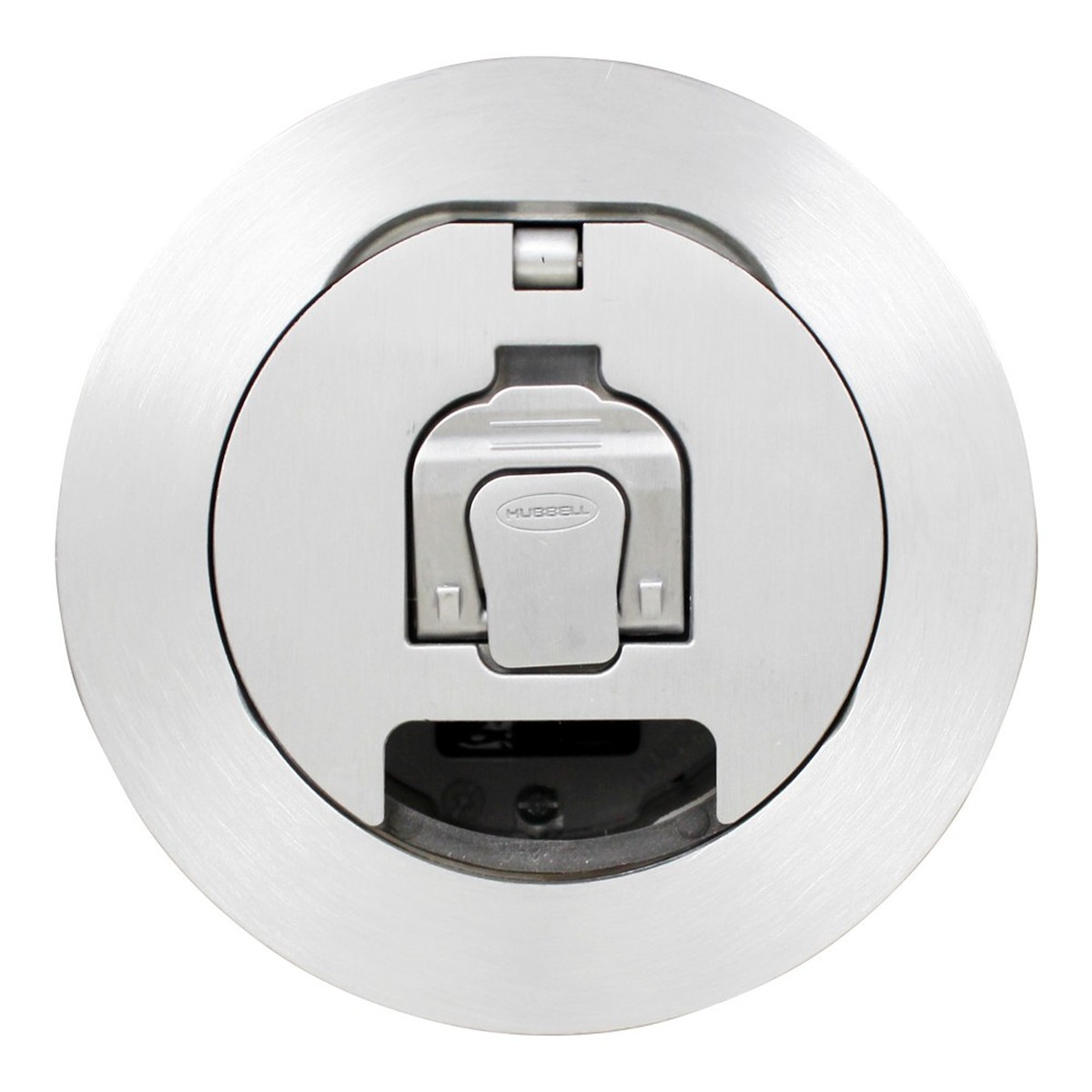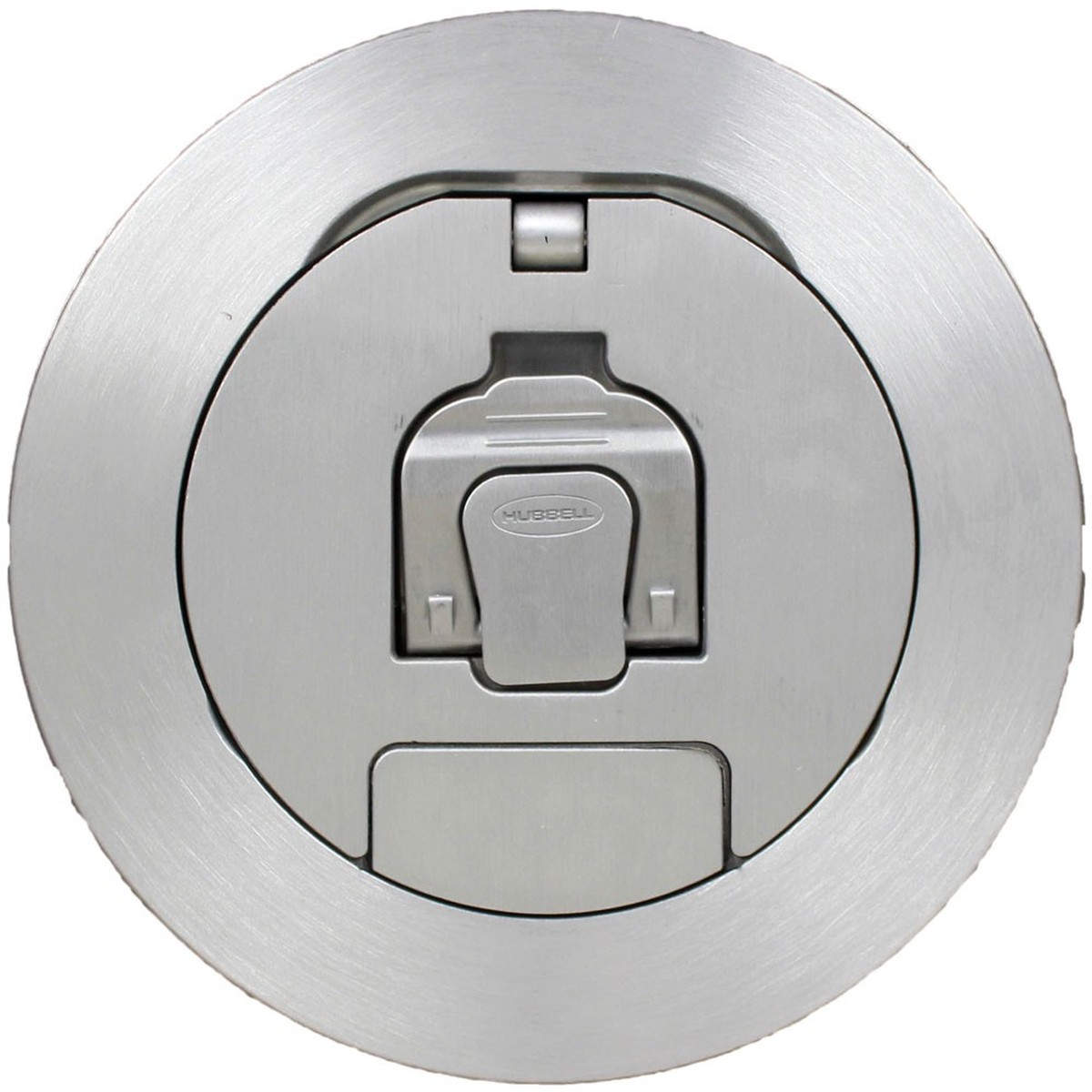 The FSR SF4-PT-ALM is a 4" round floor box poke through with a brushed aluminum finish cover. The box is fire rated and UL scrub water rated, while the top flange is only .12" thick and is ADA compliant. The entire cover swings open 180 degrees while 2 additional small doors in the cover open to allow cables to pass out of the top.