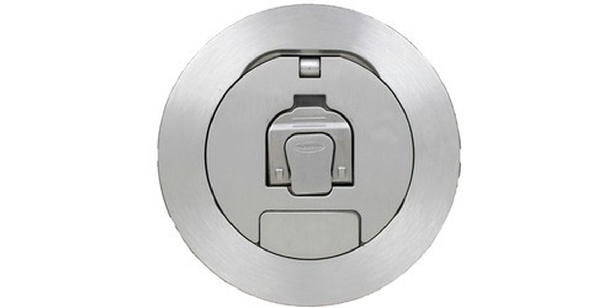 The FSR SF6-CPT-DD-ALM is a 6" fire rated poke-thru floor box with silver cover for core holes provide an elegant look in any floor. The entire cover door swings open 180° and the two smaller cable access doors fold down for cable egress while the cover door is secure, the drop down cables access doors reduce trip hazards.