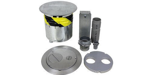 The FSR SF6-CPT-FF-ALM is a 6" fire rated poke-thru furniture feed floor box with aluminum cover for core holes provide an elegant look in any floor. The entire cover door swings open 180° and the two smaller cable access doors fold down for cable egress while the cover door is secure, the drop down cables access doors reduce trip hazards.