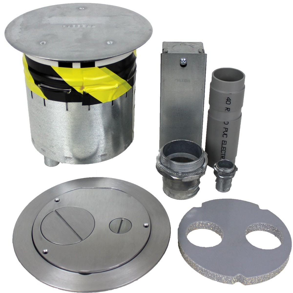 Includes: 6” floor fitting, 2" conduit fitting for data and AV, 3/4" conduit fitting for power, Cover Assembly, and Junction box.