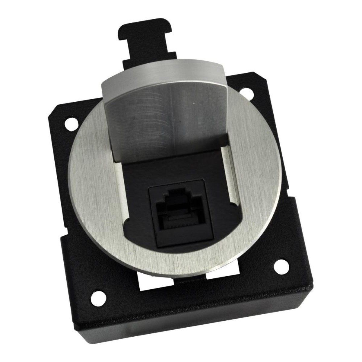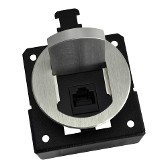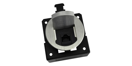 The T3-CAT5-ALM is a T3-MJ 2" mini round aluminum table box with an RJ-45 Connector. This housing style is designed to fit a 2" round hole, with mounting hardware to allow for a variety of table thickness.