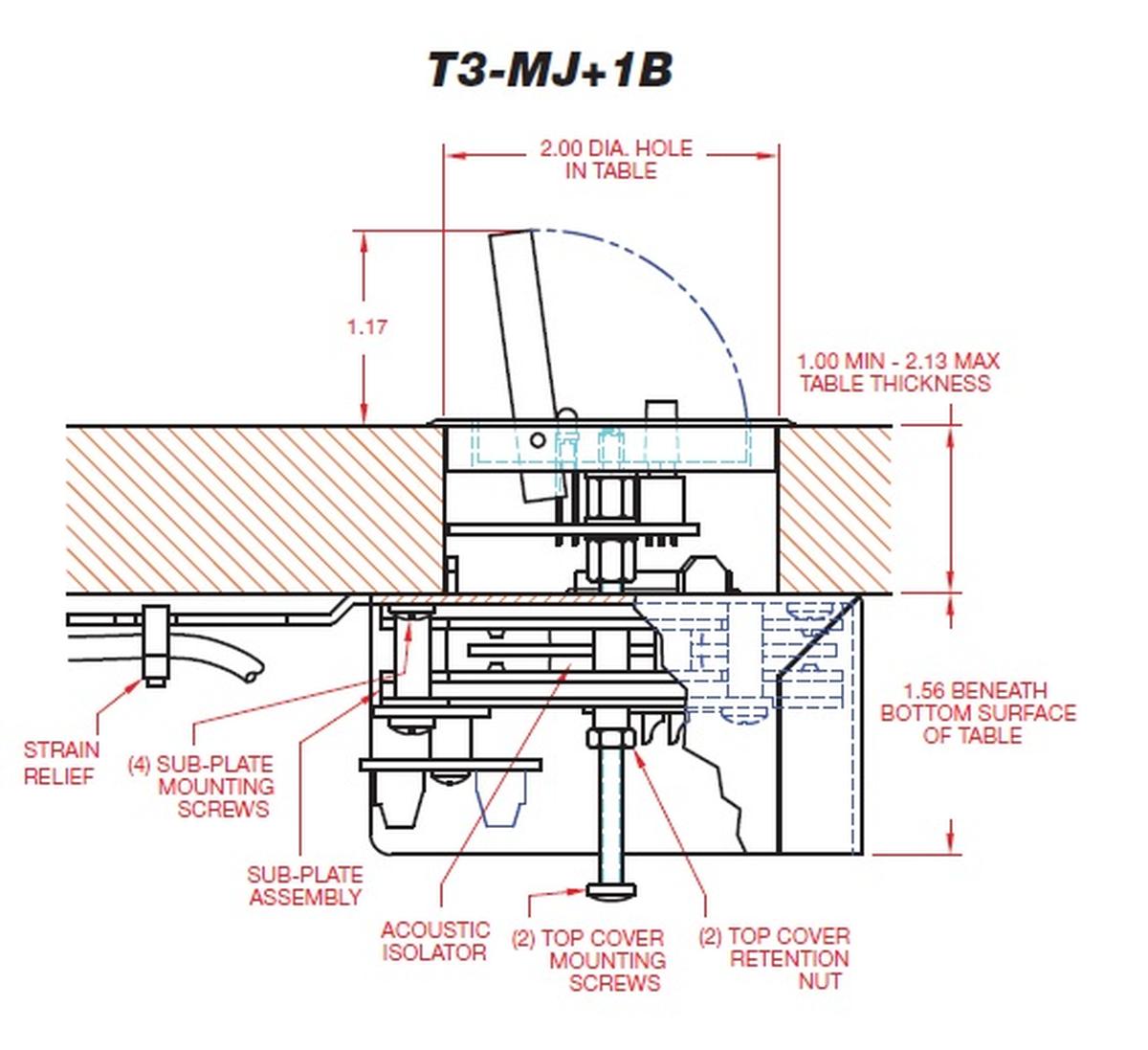 This unit offers one button control and LED to the basic T3-MJ+. You can use it as a momentary or maintain type switch (SPDT) contacts and LED wires terminate under the table to an external product as needed. A variety of options for switch action type, switch cap color, and led color are available.