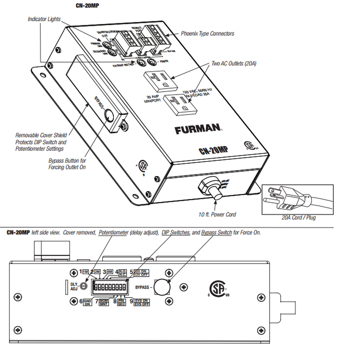 The SmartSequencing technology allows the user to remotely and safely cycle through power sequentially. It also allows large complex AV systems to bidirectionally, safely power up or down with the simple press of a button or turn of a key. With DIP switches and a potentiometer, the CN-20MP allows customization of settings such as fine tuning sequencing delays and 12V On/Off. Lending an unprecedented level of power management and control-switching options while streamlining from start to finish.