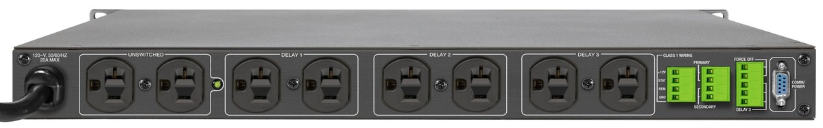 - Rear Panel Outlets: 2 Unswitched NEMA 5 20R's (1 duplex), 6 Sequenced NEMA 5-20R's (3 duplexes each controlled by separate relay)